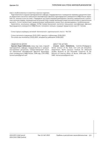 Urusova L.Kh. Statistics on terrorism: the challenge of measuring trends in global terrorism // Modern scientific research in the field of pedagogy and psychology / Collection of research results. Kirov, 2018. P. 730-736.