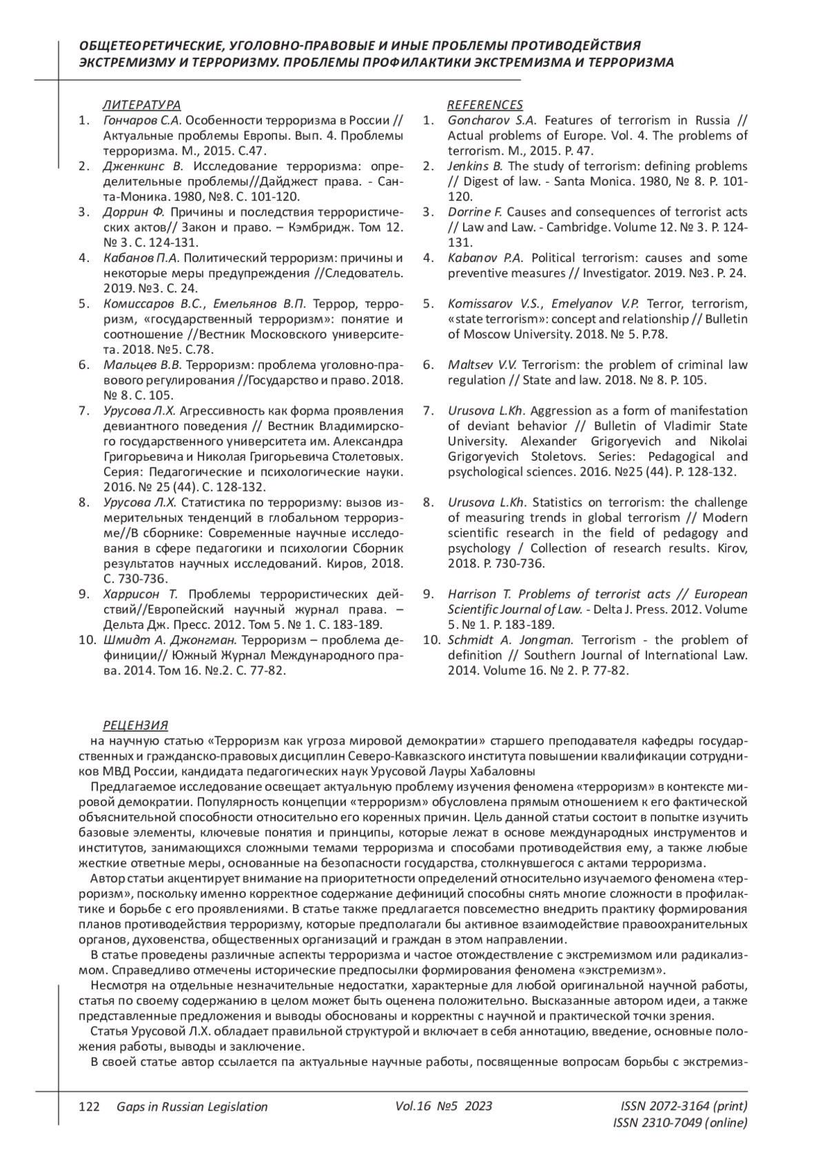 Goncharov S.A. Features of terrorism in Russia // Actual problems of Europe. Vol. 4. The problems of terrorism. M., 2015. P. 47.