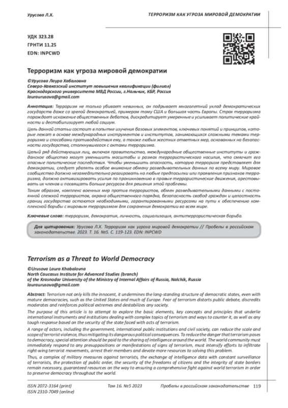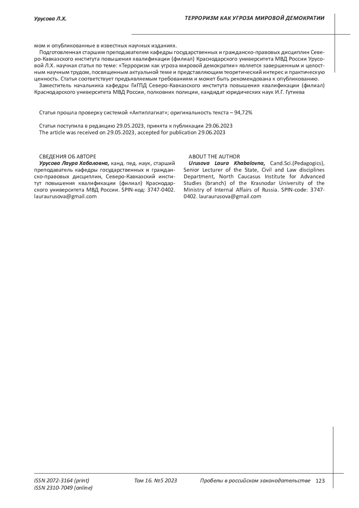 8. 	Урусова Л.Х. Статистика по терроризму: вызов измерительных тенденций в глобальном терроризме//В сборнике: Современные научные исследования в сфере педагогики и психологии Сборник результатов научных исследований. Киров, 2018. С. 730-736. EDN: USFLHL