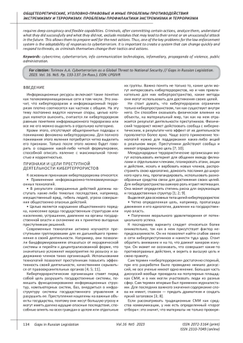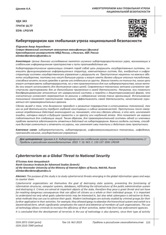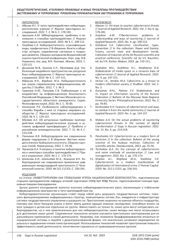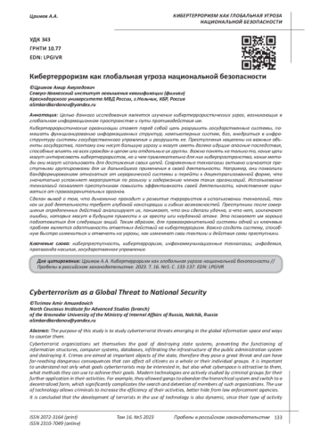2. 	Арипшев А.М. Кибертерроризм: проблемы в понимании и способах противодействия // Журнал прикладных исследований. 2023. № 4. С. 109-112. EDN: VLHRGV