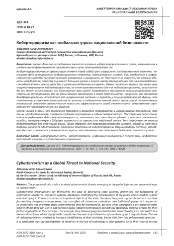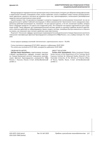 Dyshekov M.V., Kushkhov H.L., Mukhtarov D.D. Globalization of media space as a resource base of cyberterrorism // Journal of Applied Research. 2023. No. 4. pp. 147-151.