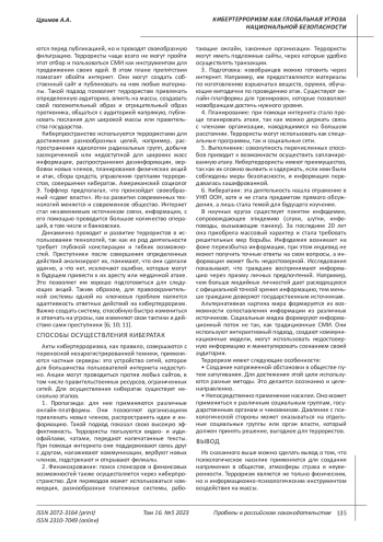 7. 	Кочесоков Р.Х. Особенности кибертерроризма и способы борьбы с ним со стороны мирового сообщества // Журнал прикладных исследований. 2023. № 4. С. 134-137. EDN: DXDKEJ