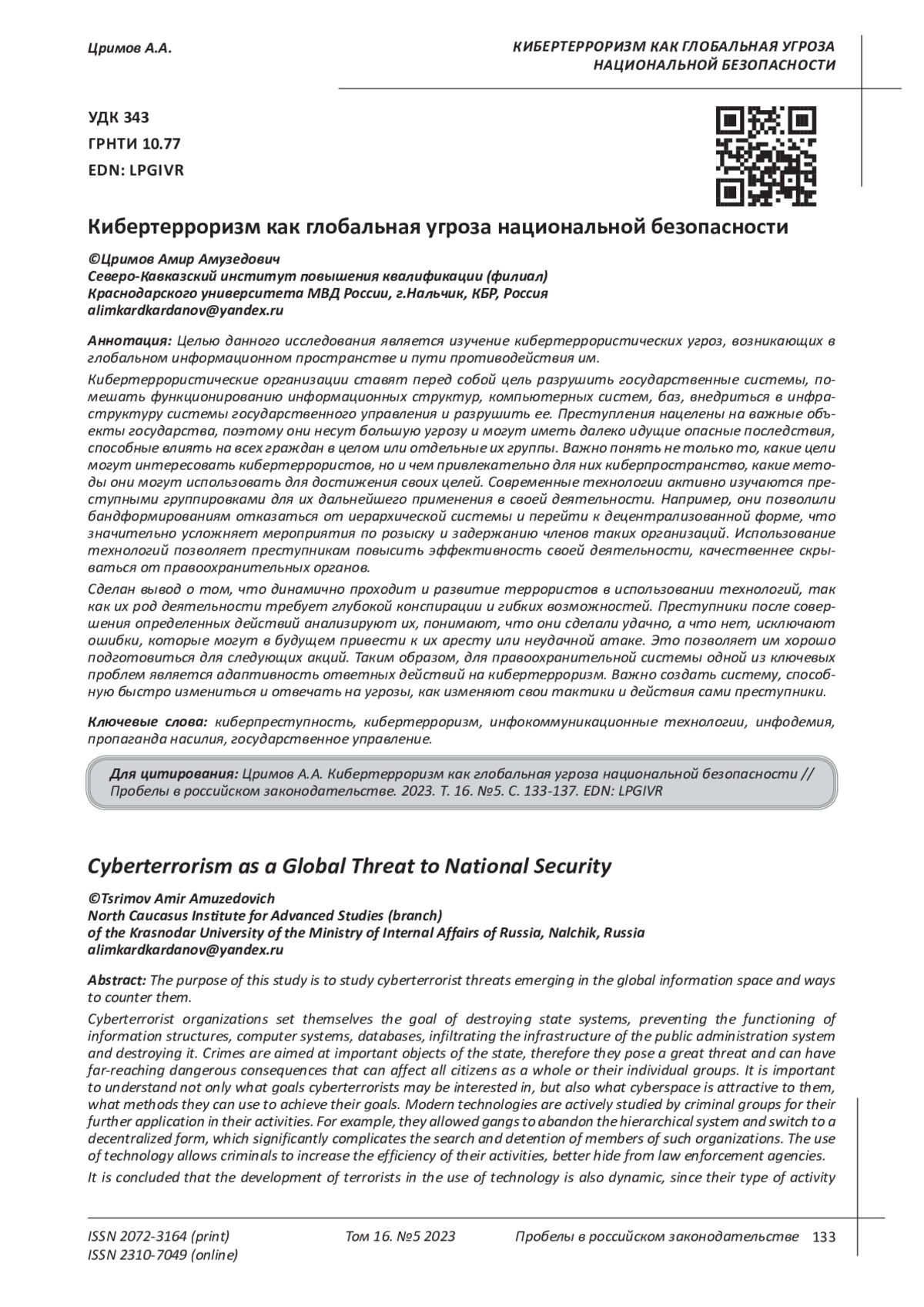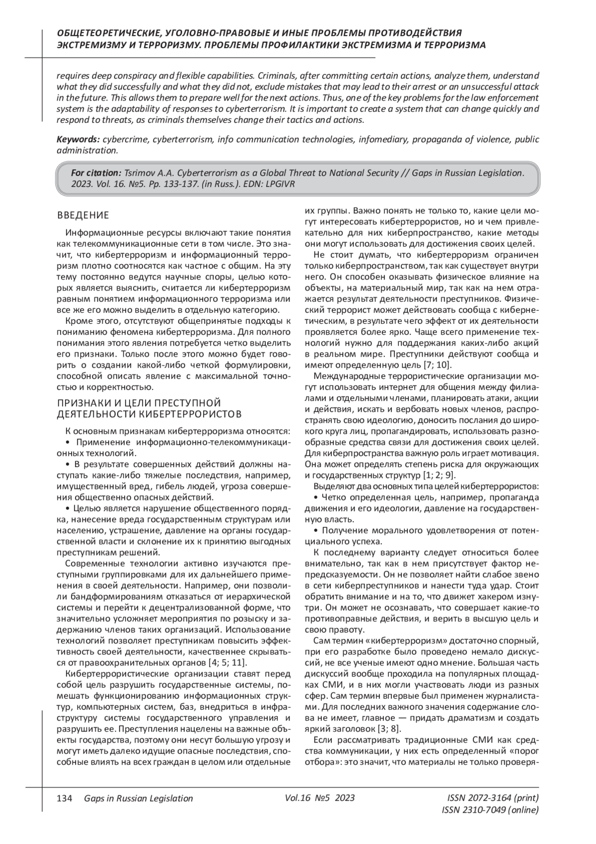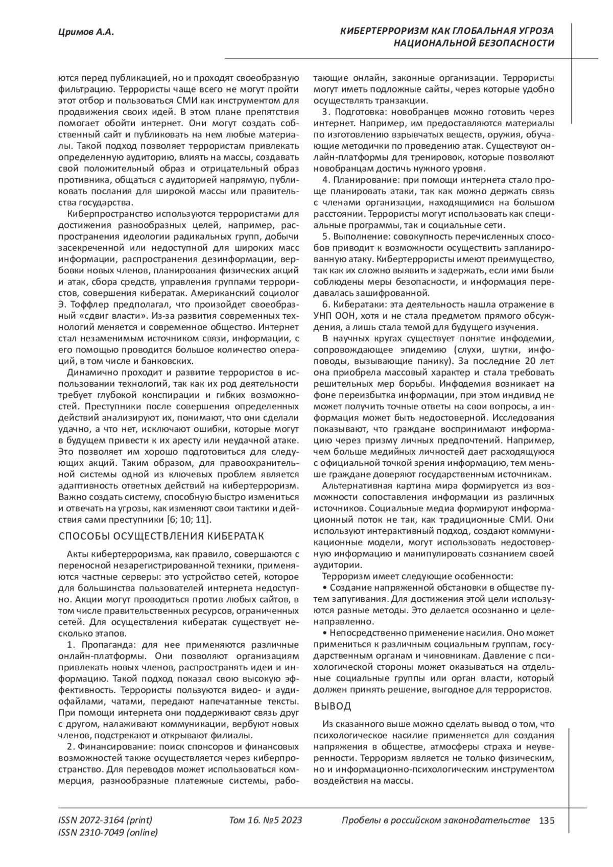 10. 	Тарчоков Б.А. К вопросу о понятии кибертерроризма и некоторых способах противодействия // Право и управление. 2023. № 2. С. 170-174.