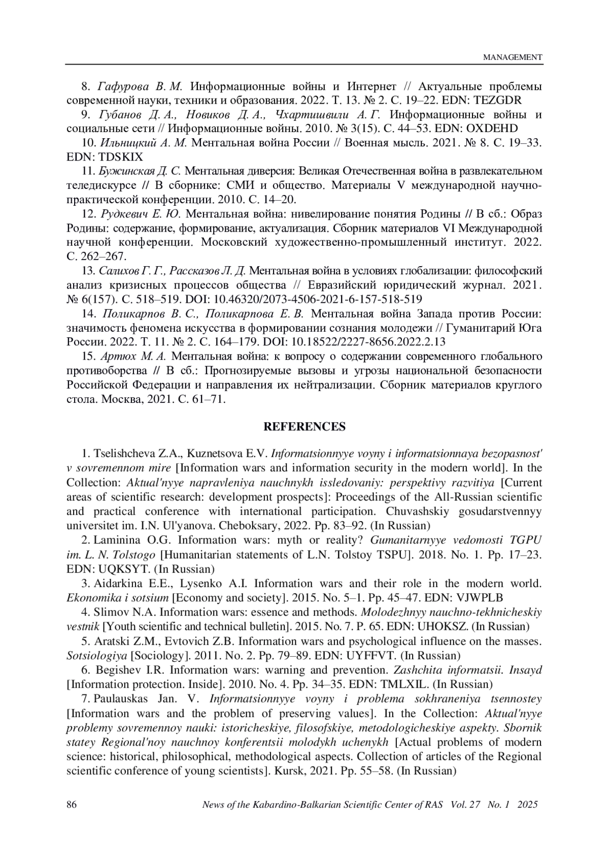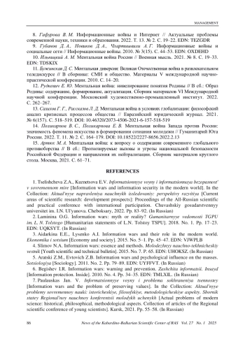 8. 	Гафурова В. М. Информационные войны и Интернет // Актуальные проблемы современной науки, техники и образования. 2022. Т. 13. № 2. С. 19-22. EDN: TEZGDR