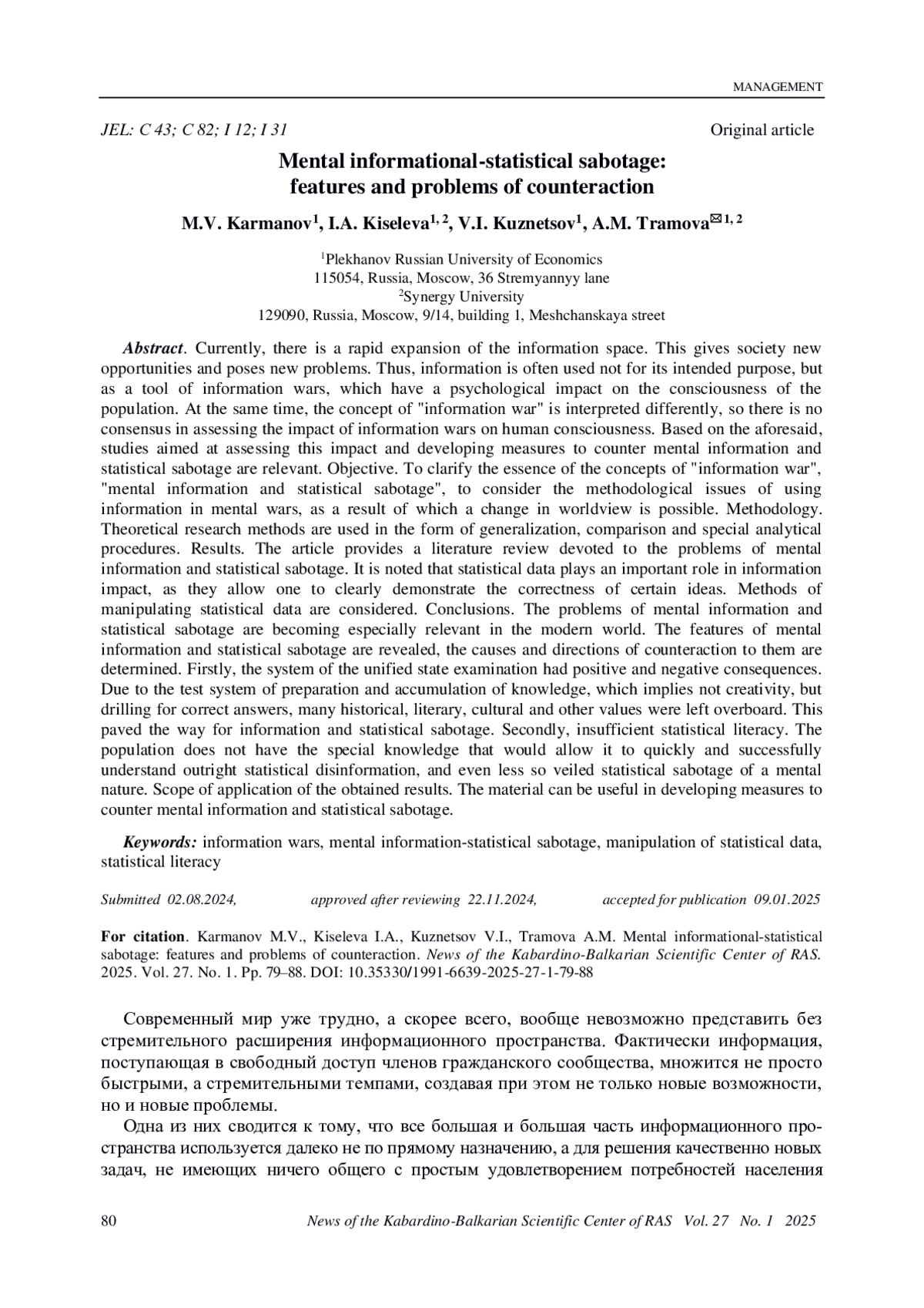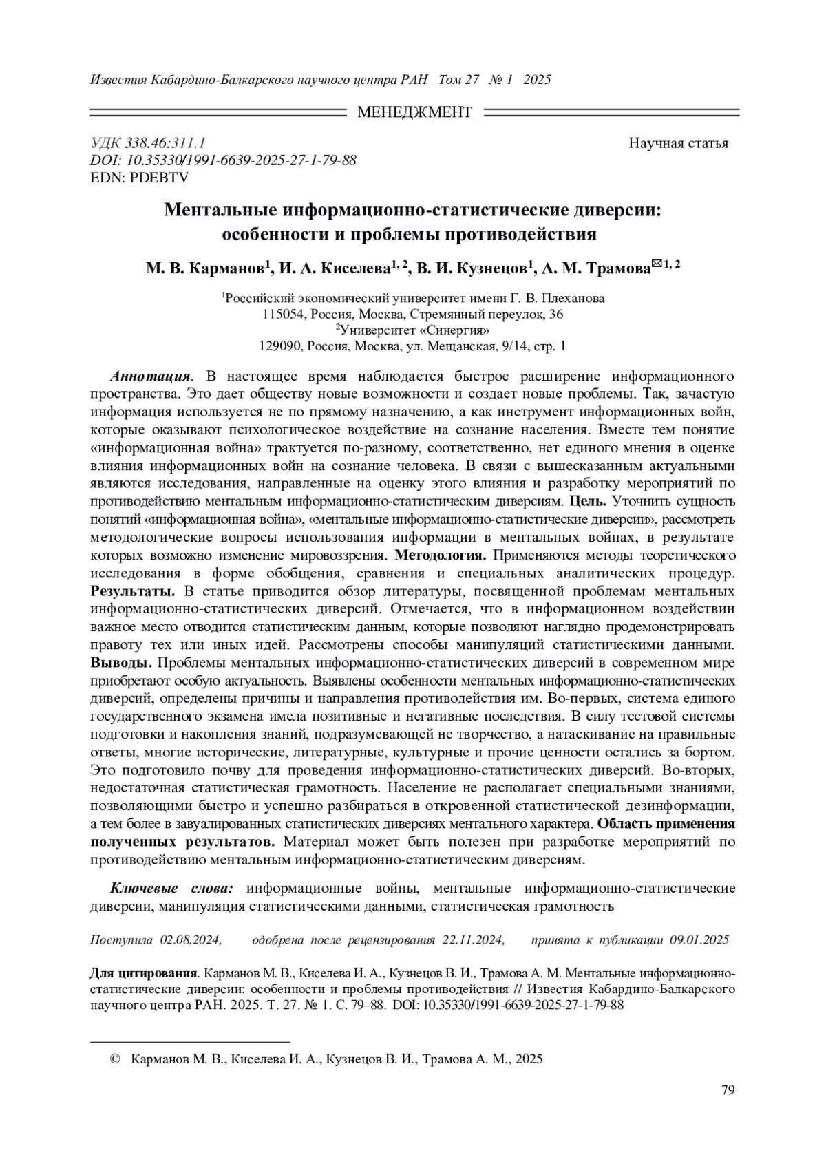 Выводы. Проблемы ментальных информационно-статистических диверсий в современном мире приобретают особую актуальность. Выявлены особенности ментальных информационно-статистических диверсий, определены причины и направления противодействия им. Во-первых, система единого государственного экзамена имела позитивные и негативные последствия. В силу тестовой системы подготовки и накопления знаний, подразумевающей не творчество, а натаскивание на правильные ответы, многие исторические, литературные, культурные и прочие ценности остались за бортом. Это подготовило почву для проведения информационно-статистических диверсий. Во-вторых, недостаточная статистическая грамотность. Население не располагает специальными знаниями, позволяющими быстро и успешно разбираться в откровенной статистической дезинформации, а тем более в завуалированных статистических диверсиях ментального характера.