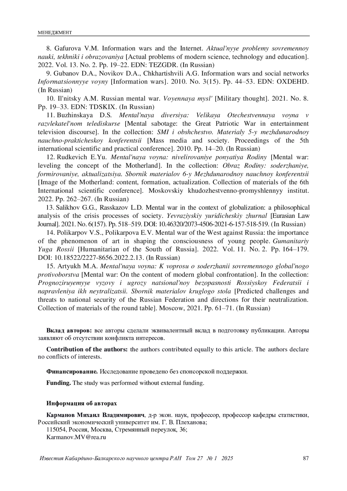 15. 	Артюх М. А. Ментальная война: к вопросу о содержании современного глобального противоборства // В сб.: Прогнозируемые вызовы и угрозы национальной безопасности Российской Федерации и направления их нейтрализации. Сборник материалов круглого стола. Москва, 2021. С. 61-71. EDN: AWWRDH