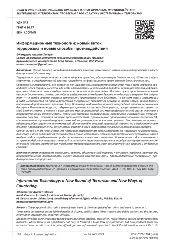 Magomedov M.N. Possibilities of using infocommunication technologies in the field of countering terrorism // Gaps in Russian legislation. 2022. Vol. 15. No. 4. pp. 141-144. EDN: VSFUYD