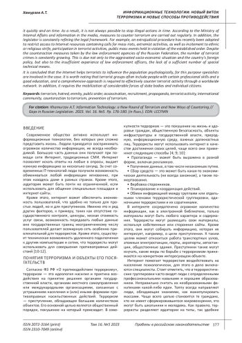 Manukyan A.R. Problems of countering terrorism and extremism on the Internet in conditions of widespread digitalization // Gaps in Russian legislation. 2021. Vol. 14. No. 3. pp. 37-41. EDN: XZBRQN