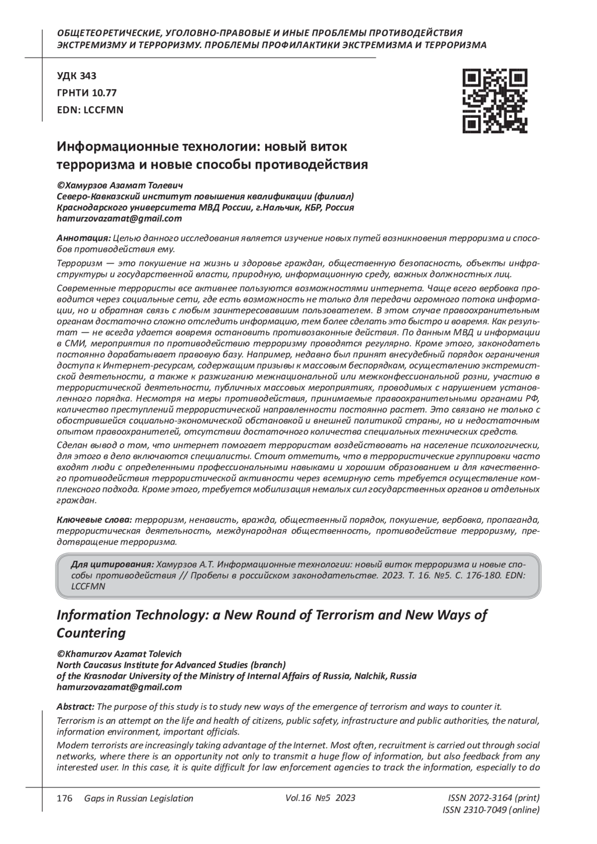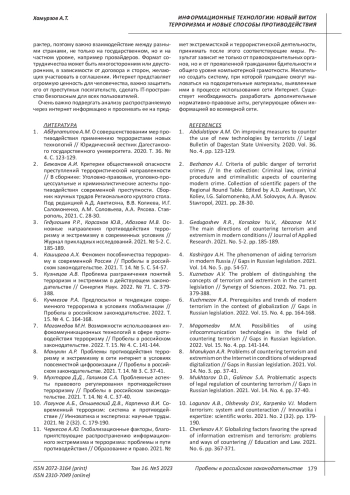 1. 	Абдулатипов А.М. О совершенствовании мер противодействия применению террористами новых технологий // Юридический вестник Дагестанского государственного университета. 2020. Т. 36. № 4. С. 123-129. EDN: BFQQXR