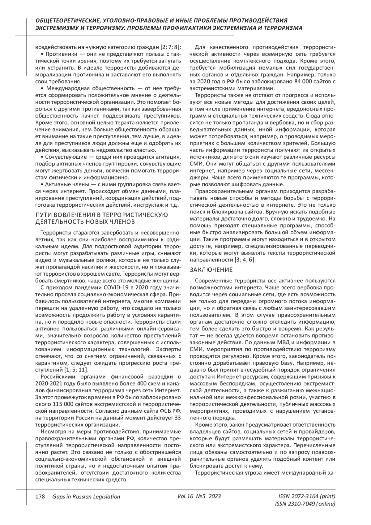 8. 	Манукян А.Р. Проблемы противодействия терроризму и экстремизму в сети интернет в условиях повсеместной цифровизации // Пробелы в российском законодательстве. 2021. Т. 14. № 3. С. 37-41. EDN: XZBRQN