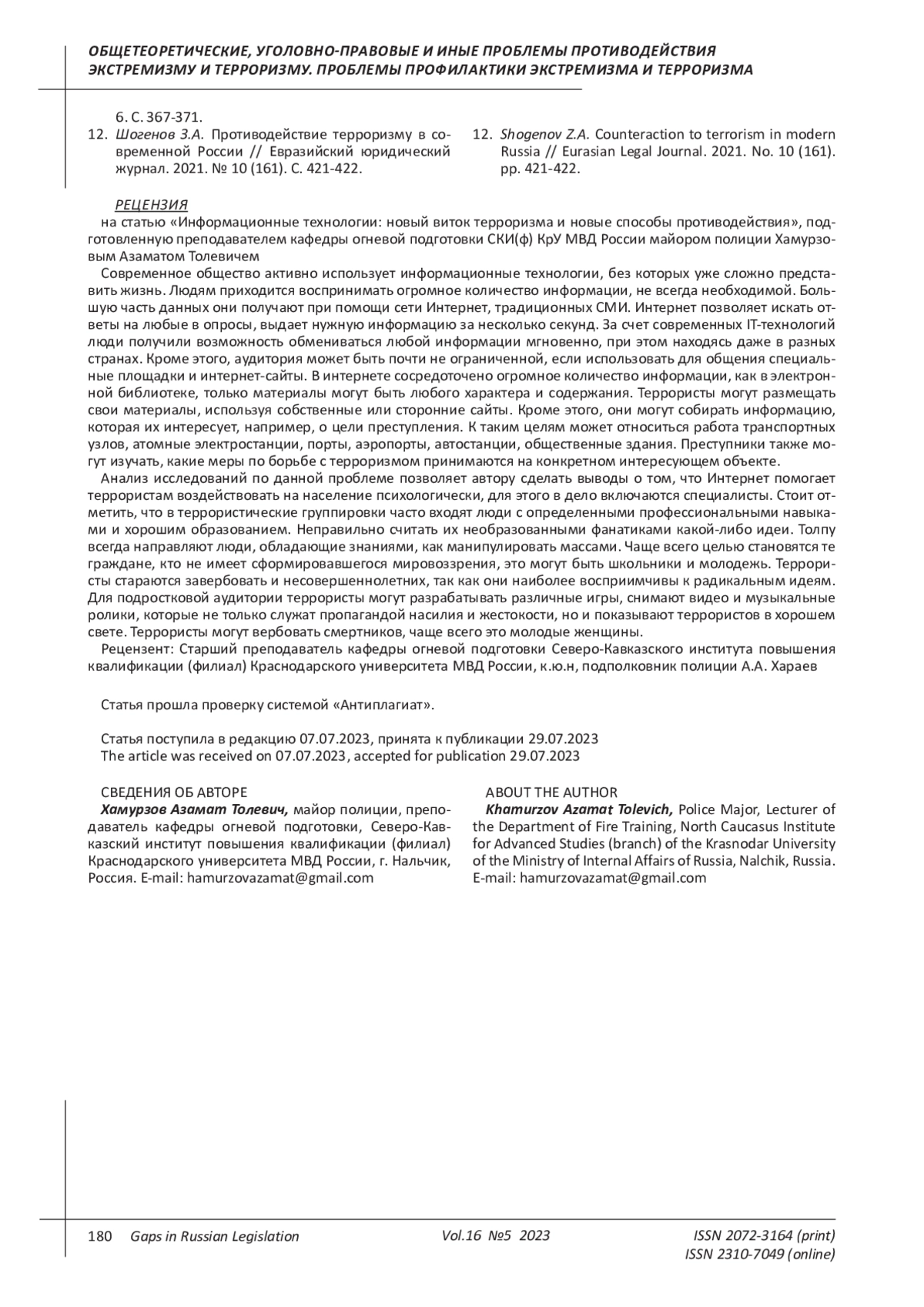 12. 	Шогенов З.А. Противодействие терроризму в современной России // Евразийский юридический журнал. 2021. № 10 (161). С. 421-422. EDN: MHGFEV