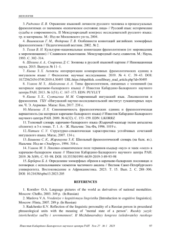 8. 	Улаков М. З., Абайханова А. А. Типы фразеологизмов, связанных с зоонимией (на материале карачаево-балкарского языка) // Известия Кабардино-Балкарского научного центра РАН. 2013. № 1(51). С. 167-173. EDN: PUYLUT