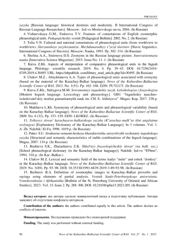15. 	Берберов Б. А. Определение зооморфных образов в карачаево-балкарских пословицах и поговорках с использованием элементов частичного анализа // Вестник Санкт-Петербургского университета. Востоковедение и Африканистика. 2023. Т. 15. Вып. 2. С. 288-306. DOI: 10.21638/spbu13.2023.205 EDN: UIMTFT