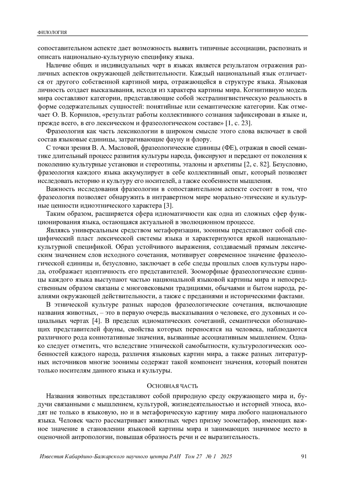 Статья посвящена проблеме национально-культурной специфики фразеологизмов с компонентом названий домашних и диких животных в разноструктурных языках. Сопоставительный анализ карачаево-балкарского и ингушского языков позволяет отразить уникальную способность народа улавливать и фиксировать то или иное сходство, расхождения между человеком и животным миром. В работе выявлены особенности метафорического использования животного мира для характеристики человека. Образ животных помогает создать яркую картину человеческих морально-нравственных качеств носителей исследуемых языков. Актуальность исследования определяется необходимостью изучения фразеологических единиц с компонентом названий домашних и диких животных в карачаево-балкарском и ингушском языках с целью выявления общих и специфических признаков, присущих данным языковым культурам. Это особенно актуально для современной лингвистики по причине еще небольшого количества специальных исследований со сравнительно-сопоставительным анализом анималистической коннотации и концептуальной метафоры в разносистемных языках. Научная новизна исследования заключается в том, что впервые предпринимается попытка сравнительно-сопоставительного анализа фразеологизмов с компонентом названий домашних и диких животных разноструктурных языков с точки зрения их национально-культурной специфики. Статья написана с целью провести сопоставительный анализ фразеологических единиц, выражений, идиом с названиями домашних и диких (хищных) животных на материале карачаево-балкарского и ингушского языков. Методологической основой исследования послужили теоретические работы, касающиеся классификации и семантического анализа фразеологизмов, которые представляют собой не только устойчивые сочетания слов с осложненной семантикой, но и единицы ментальной репрезентации. Делается акцент на том, что во фразеологических единицах c названиями домашних и диких животных заложена культурно значимая информация, которая выражается как в денотативном, так и в коннотативном аспектах значения. Материалом для исследования послужили фактологический материал из различных лексикографических источников, а также тексты из некоторых жанров фольклора, опубликованные в академических и хрестоматийных научных изданиях.