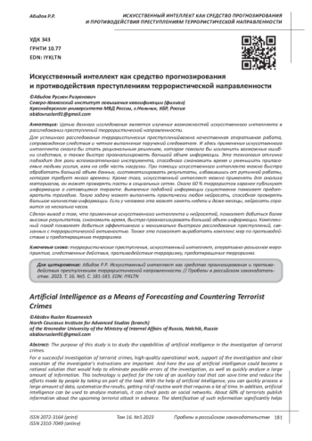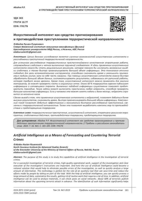 Krylov M.A. The fight against terrorism and artificial intelligence // In the collection: Issues of activity of divisions of internal affairs bodies of the Russian Federation. Collection of scientific papers. Under the general editorship of S.V. Kleshchev, Yu.V. Sidorov, E.A. Dotsenko. Tver, 2022. pp. 163-168.