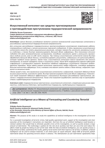 1. 	Бычков В. В., Прорвич В. А. Искусственный интеллект как средство противодействия преступлениям экстремистской направленности, совершаемым с использованием информационно-телекоммуникационных сетей, в том числе сети “Интернет” // Вестник Московской академии Следственного комитета Российской Федерации. 2020. № 4. С. 47-52. EDN: AATKFE