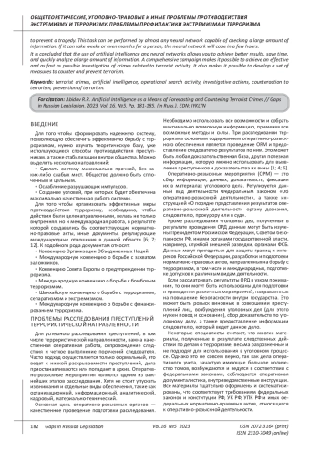 Целью данного исследования является изучение новых путей возникновения терроризма и способов противодействия ему. Терроризм - это покушение на жизнь и здоровье граждан, общественную безопасность, объекты инфраструктуры и государственной власти, природную, информационную среду, важных должностных лиц. Современные террористы все активнее пользуются возможностями интернета. Чаще всего вербовка проводится через социальные сети, где есть возможность не только для передачи огромного потока информации, но и обратная связь с любым заинтересовавшим пользователем. В этом случае правоохранительным органам достаточно сложно отследить информацию, тем более сделать это быстро и вовремя. Как результат - не всегда удается вовремя остановить противозаконные действия. По данным МВД и информации в СМИ, мероприятия по противодействию терроризму проводятся регулярно. Кроме этого, законодатель постоянно дорабатывает правовую базу. Например, недавно был принят внесудебный порядок ограничения доступа к Интернет-ресурсам, содержащим призывы к массовым беспорядкам, осуществлению экстремистской деятельности, а также к разжиганию межнациональной или межконфессиональной розни, участию в террористической деятельности, публичных массовых мероприятиях, проводимых с нарушением установленного порядка. Несмотря на меры противодействия, принимаемые правоохранительными органами РФ, количество преступлений террористической направленности постоянно растет. Это связано не только с обострившейся социально-экономической обстановкой и внешней политикой страны, но и недостаточным опытом правоохранителей, отсутствии достаточного количества специальных технических средств. Сделан вывод о том, что интернет помогает террористам воздействовать на население психологически, для этого в дело включаются специалисты. Стоит отметить, что в террористические группировки часто входят люди с определенными профессиональными навыками и хорошим образованием и для качественного противодействия террористической активности через всемирную сеть требуется осуществление комплексного подхода. Кроме этого, требуется мобилизация немалых сил государственных органов и отдельных граждан.