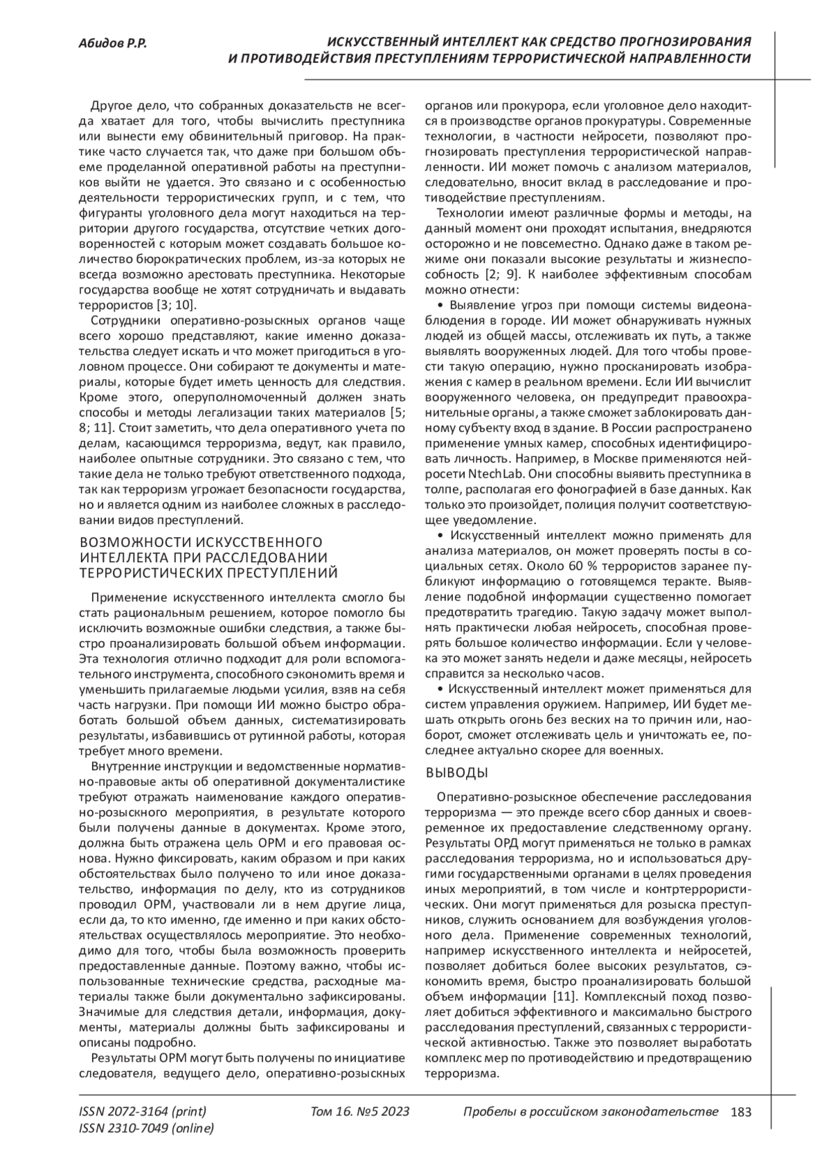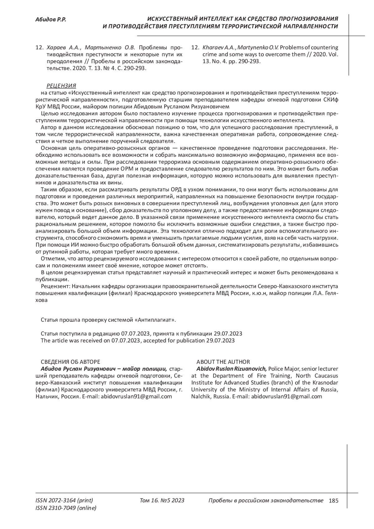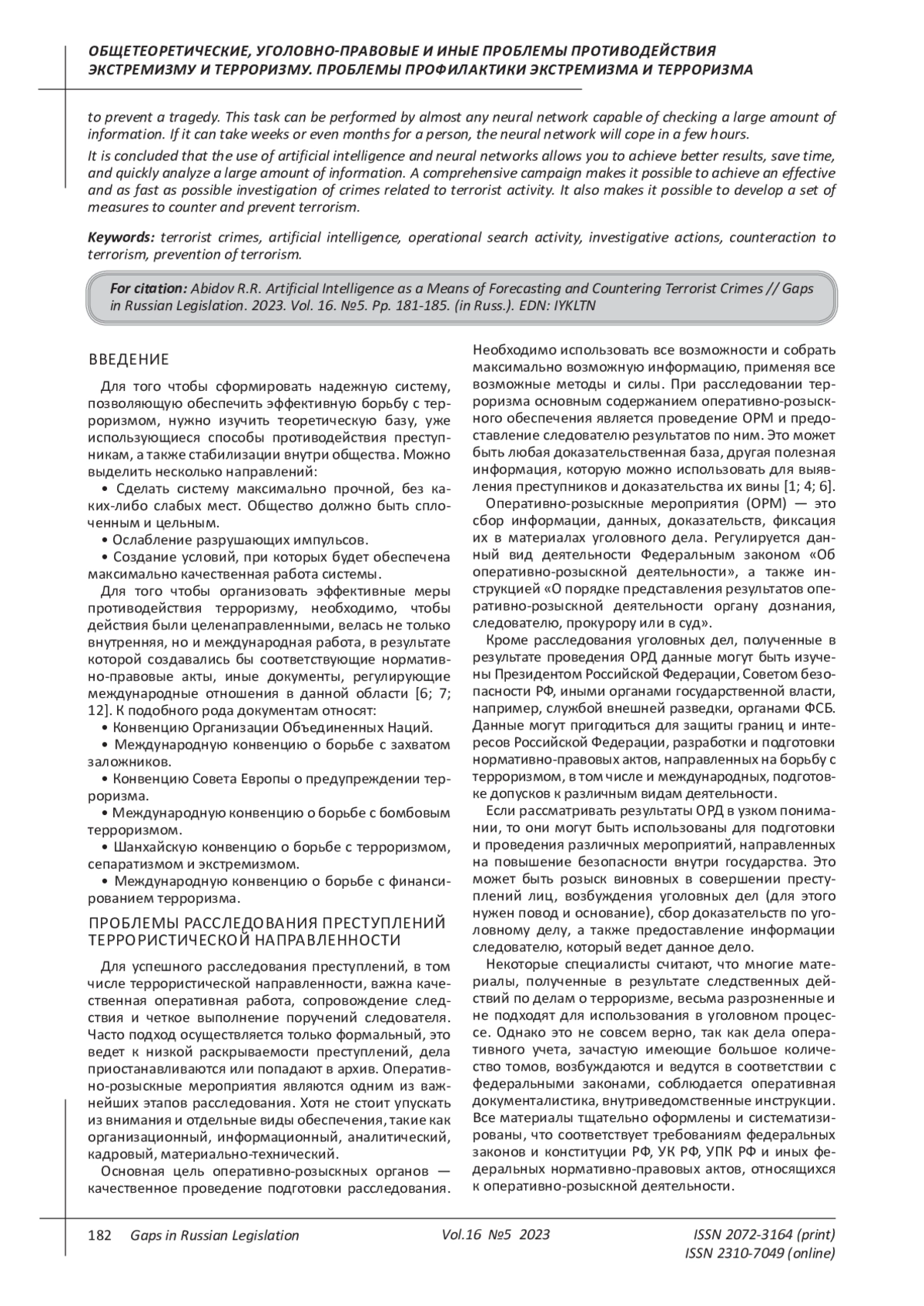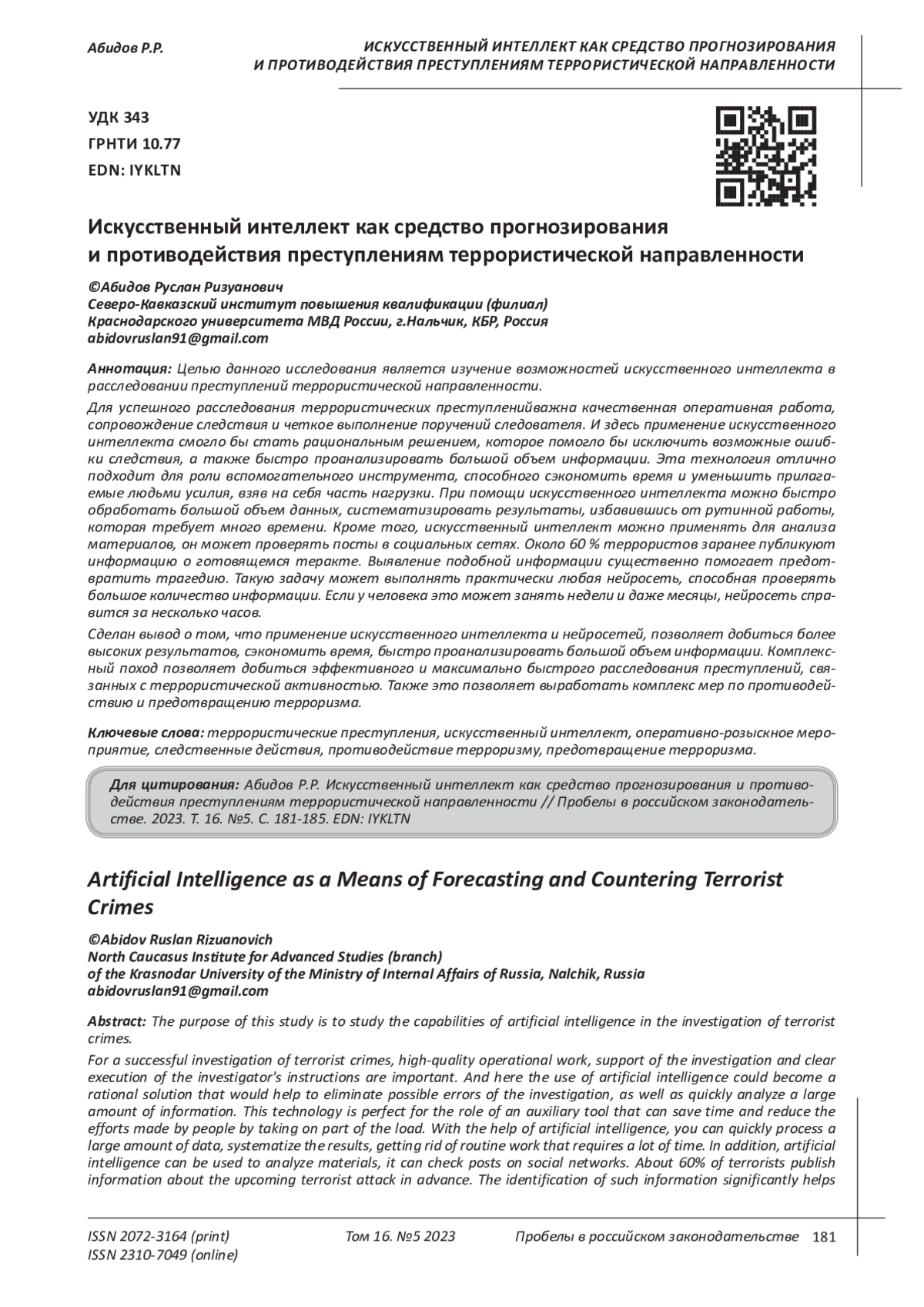 7. 	Крылов М.А. Борьба с терроризмом и искусственный интеллект // В сборнике: Вопросы деятельности подразделений органов внутренних дел Российской Федерации. Сборник научных трудов. Под общей редакцией С.В. Клещёва, Ю.В. Сидорова, Е.А. Доценко. Тверь, 2022. С. 163-168. EDN: MQGYYG