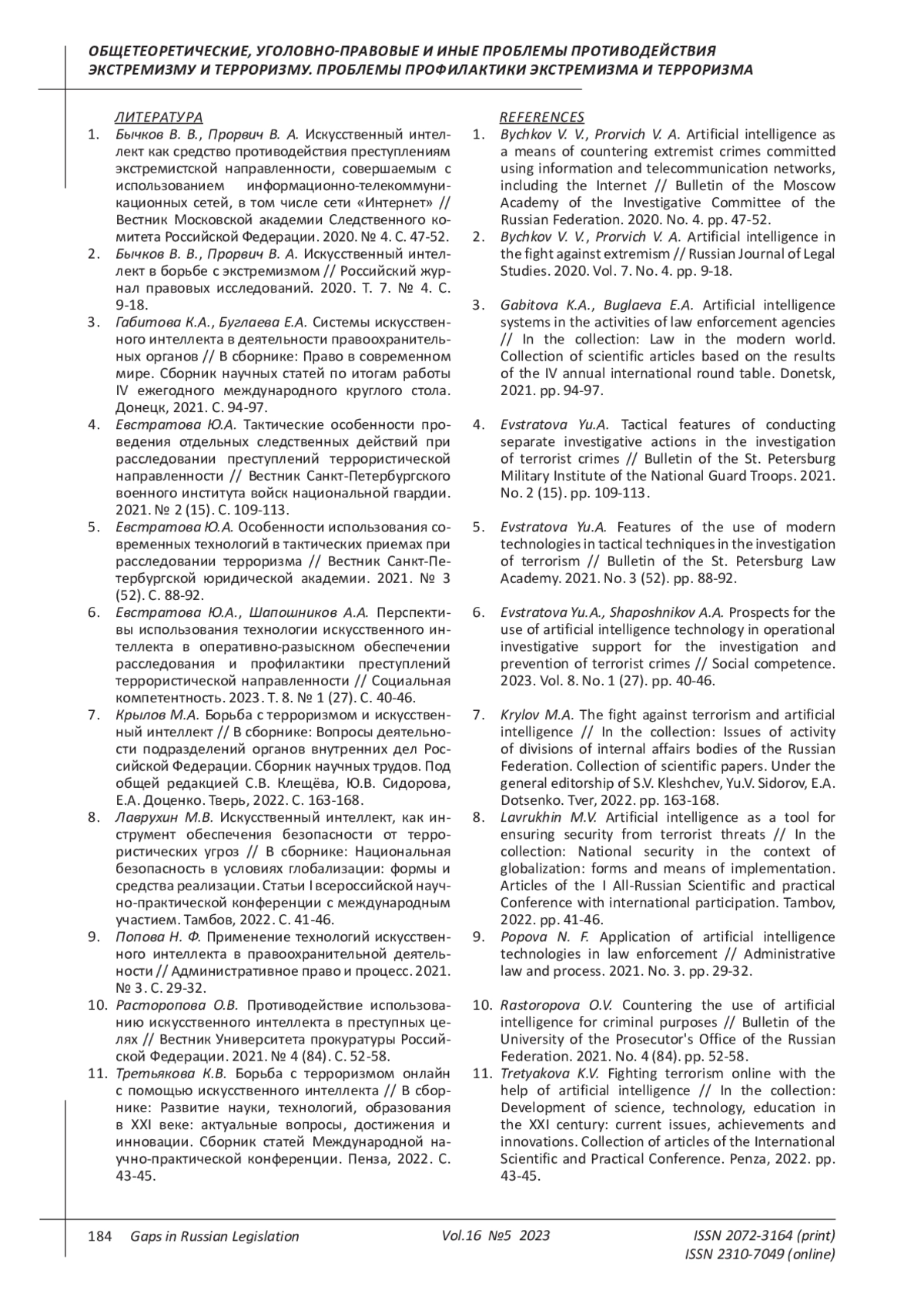 2. 	Бычков В. В., Прорвич В. А. Искусственный интеллект в борьбе с экстремизмом // Российский журнал правовых исследований. 2020. Т. 7. № 4. С. 9-18. EDN: SNGDGS