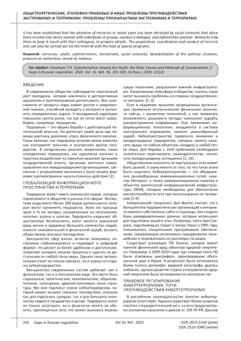 Tsrimov A.A. Features of the use of digital technologies in countering cyberterrorism // Gaps in Russian legislation. 2022. Vol. 15. No. 4. pp. 145-148. EDN: AKRVMA