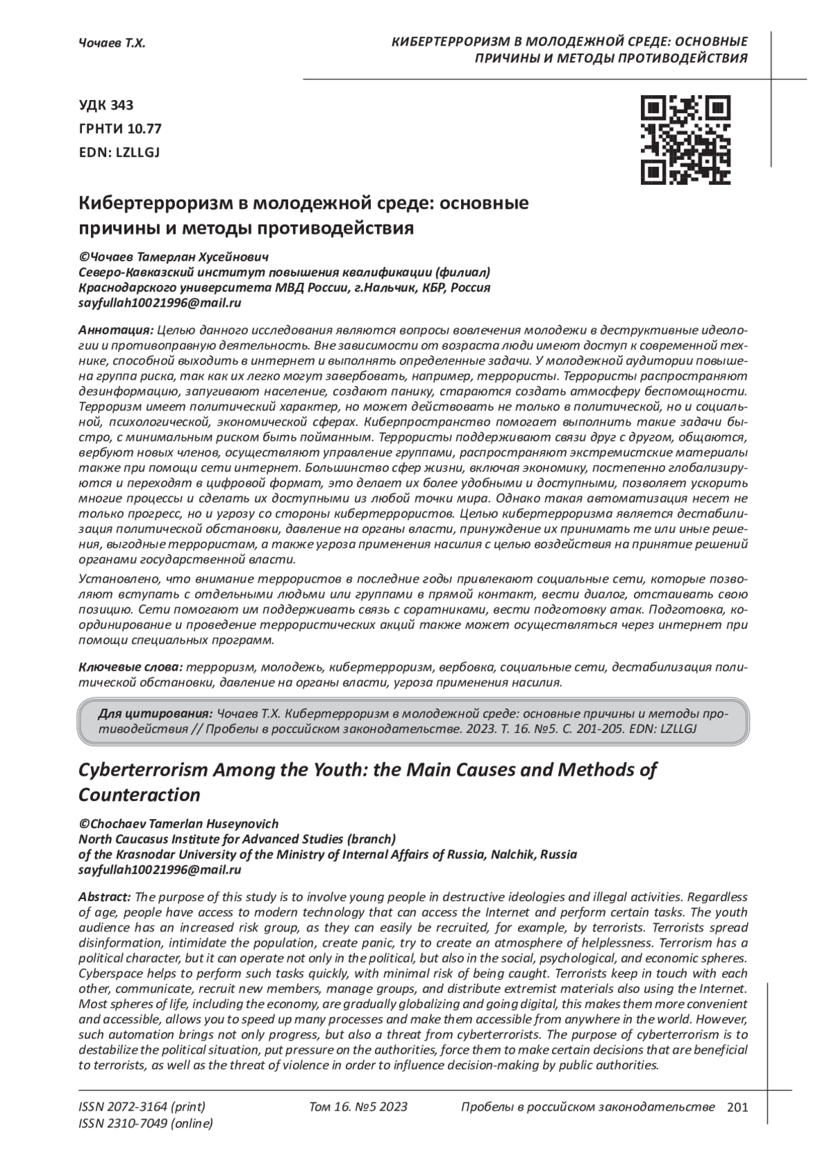 Khamurzov A.T. Cyberterrorism: new challenges and counteraction measures // Journal of Applied Research. 2021. No. 3-2. pp. 74-77.
