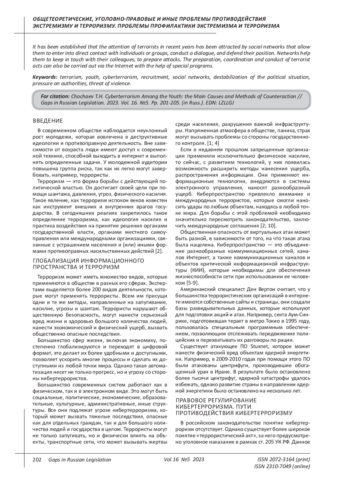 8. Хамурзов А.Т. Кибертерроризм: новые вызовы и меры противодействия // Журнал прикладных исследований. 2021. № 3-2. С. 74-77. EDN: ARTAJU