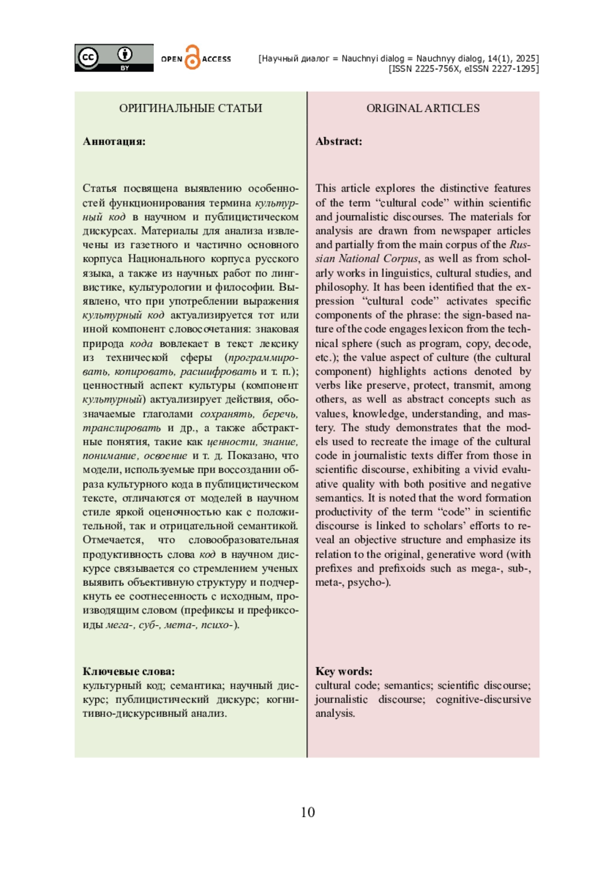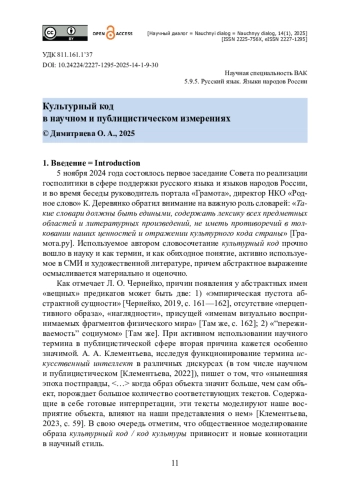 Статья посвящена выявлению особенностей функционирования термина культурный код в научном и публицистическом дискурсах. Материалы для анализа извлечены из газетного и частично основного корпуса Национального корпуса русского языка, а также из научных работ по лингвистике, культурологии и философии. Выявлено, что при употреблении выражения культурный код актуализируется тот или иной компонент словосочетания: знаковая природа кода вовлекает в текст лексику из технической сферы (программировать, копировать, расшифровать и т. п.); ценностный аспект культуры (компонент культурный) актуализирует действия, обозначаемые глаголами сохранять, беречь, транслировать и др., а также абстрактные понятия, такие как ценности, знание, понимание, освоение и т. д. Показано, что модели, используемые при воссоздании образа культурного кода в публицистическом тексте, отличаются от моделей в научном стиле яркой оценочностью как с положительной, так и отрицательной семантикой. Отмечается, что словообразовательная продуктивность слова код в научном дискурсе связывается со стремлением ученых выявить объективную структуру и подчеркнуть ее соотнесенность с исходным, производящим словом (префиксы и префиксоиды мега-, суб-, мета-, психо-).
