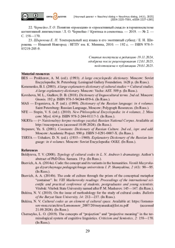30. Чернейко Л. О. Понятия «проекция» и «проективный смысл» в терминосистеме когнитивной лингвистики / Л. О. Чернейко // Критика и семиотика. - 2019. - № 2. - С. 158-170.