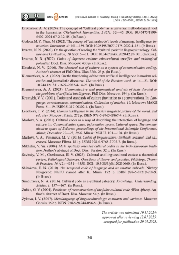 14. Гудова М. Ю. Концепт «культурный код» : уровни значения / М. Ю. Гудова, М, Юань // Интеллект. Инновации. Инвестиции. - 2022. - № 4. - С. 151-159. - https://doi.org/10.25198/2077-7175-2022-4-151.