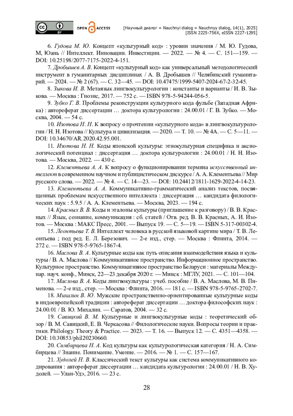 18. Изотова Н. Н. К вопросу о прочтении «культурного кода» в лингвокультурологии / Н. Н. Изотова // Культура и цивилизация. - 2020. - Т. 10. - № 4А. - С. 5-11. - https://doi.org/10.34670/AR.2020.42.95.001.