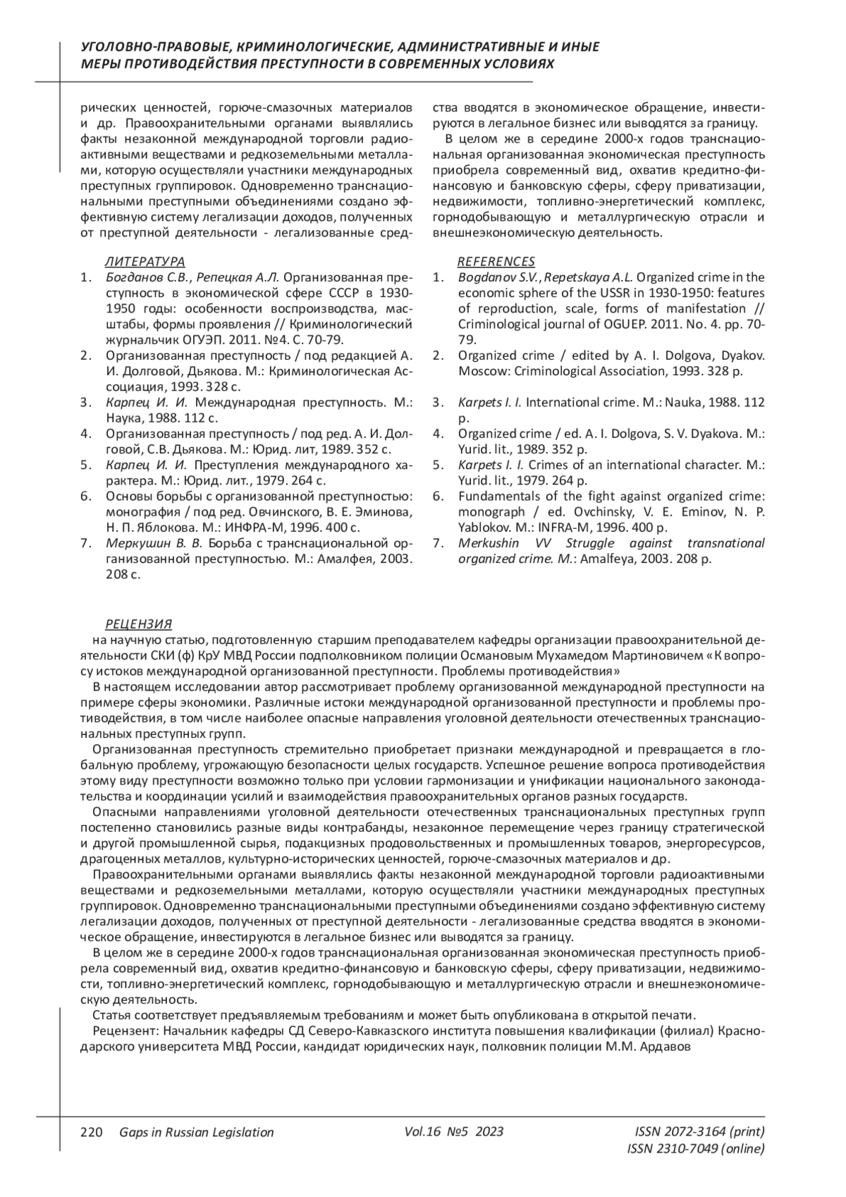 Bogdanov S.V., Repetskaya A.L. Organized crime in the economic sphere of the USSR in 1930-1950: features of reproduction, scale, forms of manifestation // Criminological journal of OGUEP. 2011. No. 4. pp. 70-79.