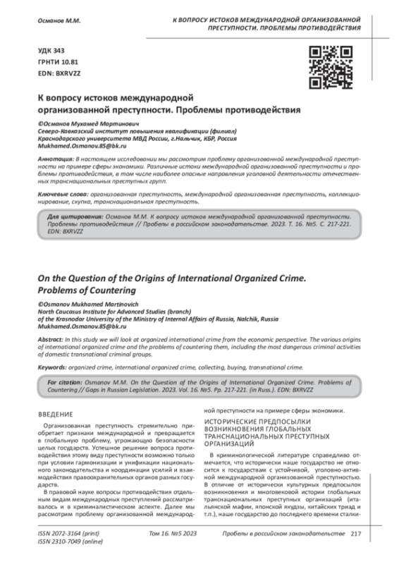 В настоящем исследовании мы рассмотрим проблему организованной международной преступности на примере сферы экономики. Различные истоки международной организованной преступности и проблемы противодействия, в том числе наиболее опасные направления уголовной деятельности отечественных транснациональных преступных групп.