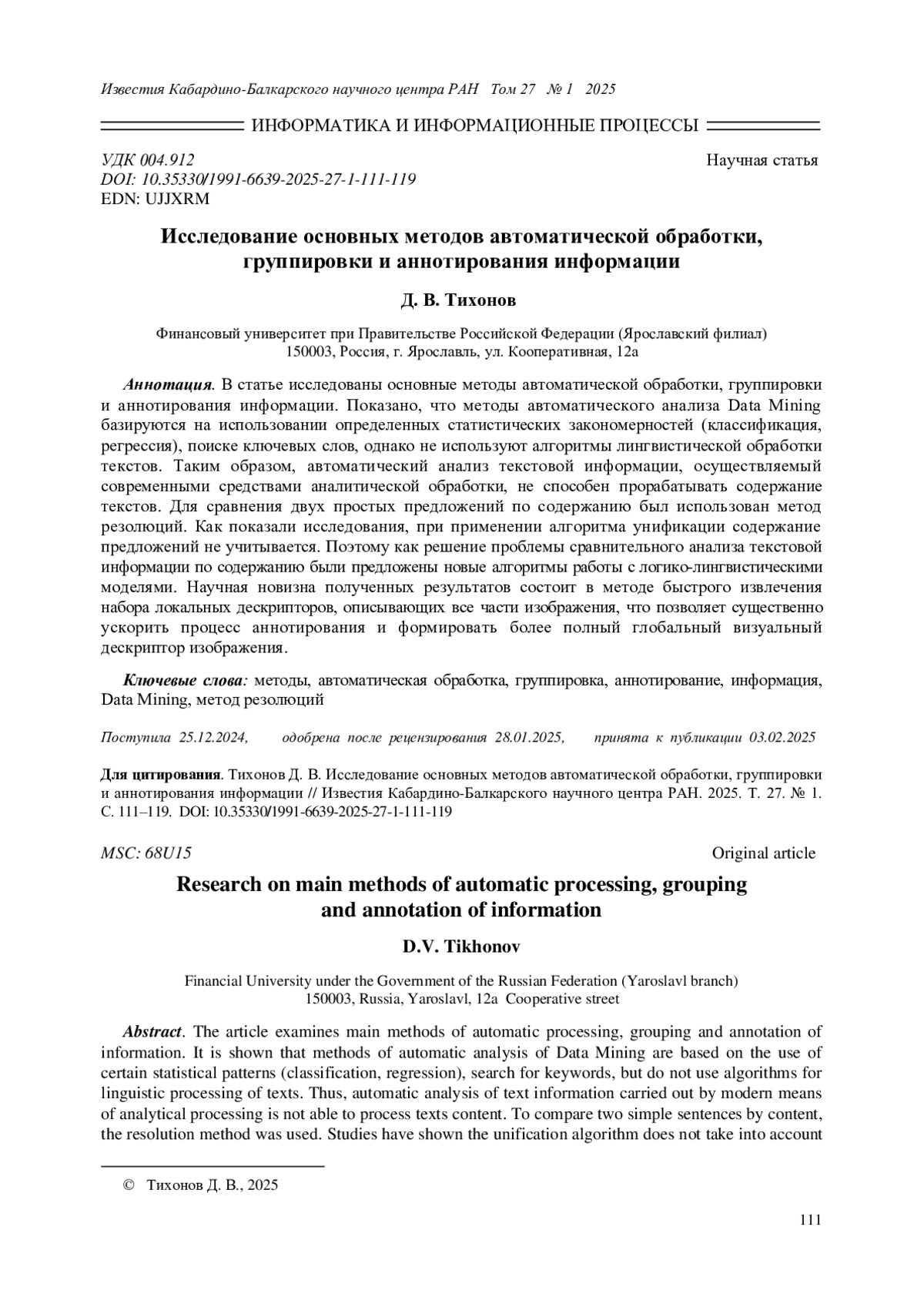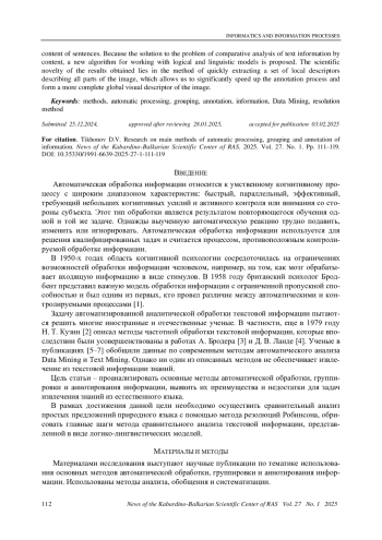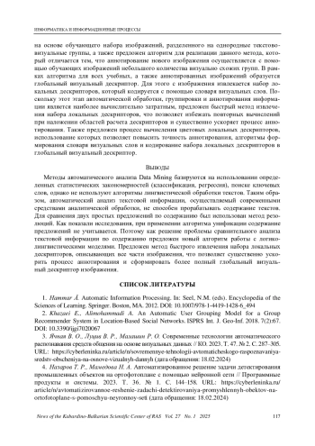 В статье исследованы основные методы автоматической обработки, группировки и аннотирования информации. Показано, что методы автоматического анализа Data Mining базируются на использовании определенных статистических закономерностей (классификация, регрессия), поиске ключевых слов, однако не используют алгоритмы лингвистической обработки текстов. Таким образом, автоматический анализ текстовой информации, осуществляемый современными средствами аналитической обработки, не способен прорабатывать содержание текстов. Для сравнения двух простых предложений по содержанию был использован метод резолюций. Как показали исследования, при применении алгоритма унификации содержание предложений не учитывается. Поэтому как решение проблемы сравнительного анализа текстовой информации по содержанию были предложены новые алгоритмы работы с логико-лингвистическими моделями. Научная новизна полученных результатов состоит в методе быстрого извлечения набора локальных дескрипторов, описывающих все части изображения, что позволяет существенно ускорить процесс аннотирования и формировать более полный глобальный визуальный дескриптор изображения.