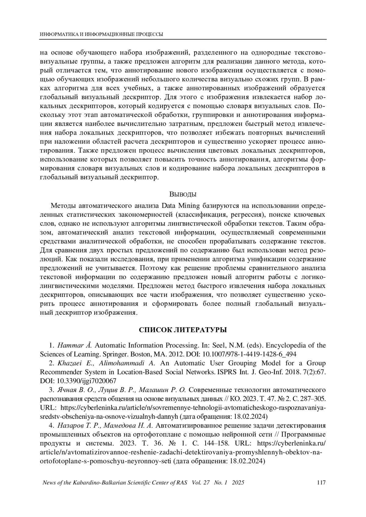 3. 	Ячная В. О., Луцив В. Р., Малашин Р. О. Современные технологии автоматического распознавания средств общения на основе визуальных данных // КО. 2023. Т. 47. № 2. С. 287-305. URL: https://cyberleninka.ru/article/n/sovremennye-tehnologii-avtomaticheskogo-raspoznavaniyasredstv-obscheniya-na-osnove-vizualnyh-dannyh (дата обращения: 18.02.2024).
