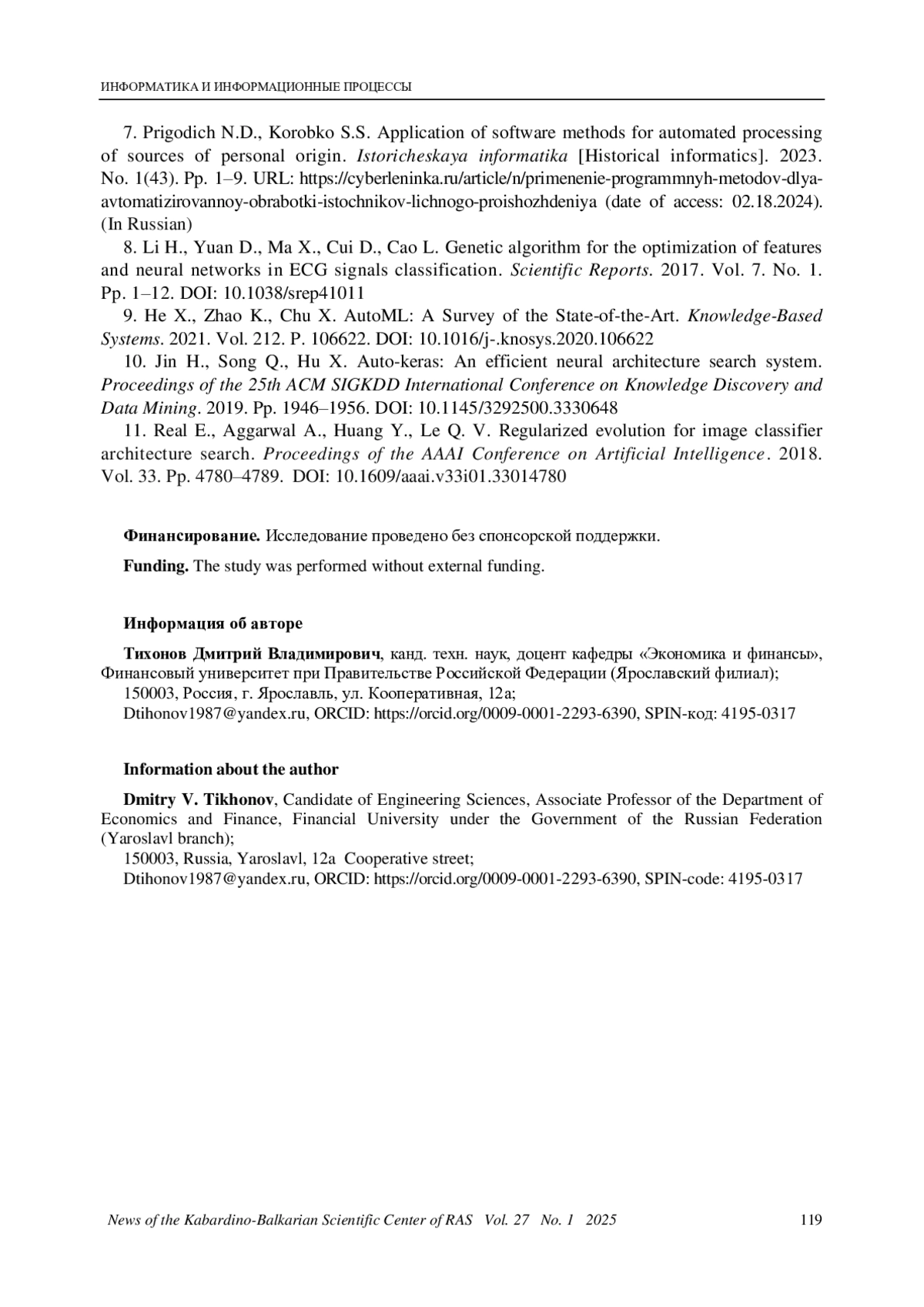 8. 	Li H., Yuan D., Ma X., Cui D., Cao L. Genetic algorithm for the optimization of features and neural networks in ECG signals classification // Scientific Reports. 2017. Vol. 7. No. 1. Pp. 1-12. DOI: 10.1038/srep41011 EDN: XOLTTA