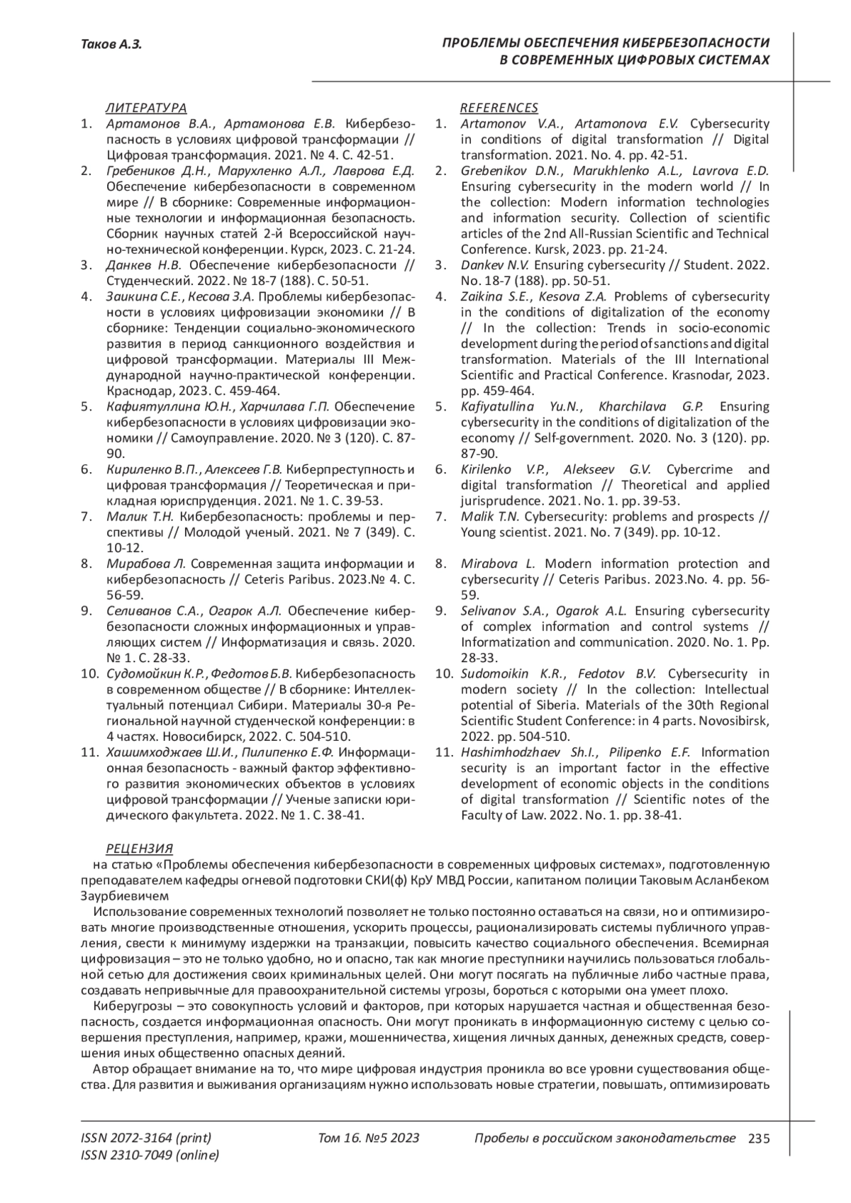 1. 	Артамонов В.А., Артамонова Е.В. Кибербезопасность в условиях цифровой трансформации // Цифровая трансформация. 2021. № 4. С. 42-51. EDN: UAEDNR
