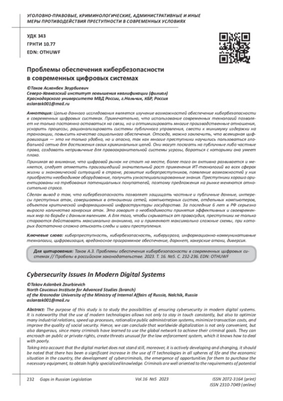 Целью данного исследования является изучение возможностей обеспечение кибербезопасности в современных цифровых системах. Примечательно, что использование современных технологий позволяет не только постоянно оставаться на связи, но и оптимизировать многие производственные отношения, ускорить процессы, рационализировать системы публичного управления, свести к минимуму издержки на транзакции, повысить качество социального обеспечения. Отсюда, можно заключить, что всемирная цифровизация - это не только удобно, но и опасно, так как многие преступники научились пользоваться глобальной сетью для достижения своих криминальных целей. Они могут посягать на публичные либо частные права, создавать непривычные для правоохранительной системы угрозы, бороться с которыми она умеет плохо. Принимая во внимание, что цифровой рынок не стоит на месте, более того он активно развивается и меняется, следует отметить произошедший значительный рост применения ИТ-технологий во всех сферах жизни и экономической ситуацией в стране, развитие киберпреступников, появление возможностей у них приобрести необходимое оборудование, получить узкоспециализированные знания. Преступники хорошо ориентированы на требования потенциальных покупателей, поэтому предложения на рынке меняются относительно спроса. Сделан вывод о том, что кибербезопасность позволяет защищать частные и публичные данные, интересы преступных атак, совершаемых в отношении сетей, компьютерных систем, отдельных компьютеров, объектов критической информационной инфраструктуры государства. За последние 6 лет в РФ серьезно выросло количество хакерских атак. Это говорит о необходимости принятия эффективных и своевременных мер по борьбе с данным явлением. А для того, чтобы скрываться от правосудия, преступники не только стараются действовать максимально анонимно, но и применяют максимально сложные схемы, при которых достаточно сложно отыскать следы и шаги преступления.