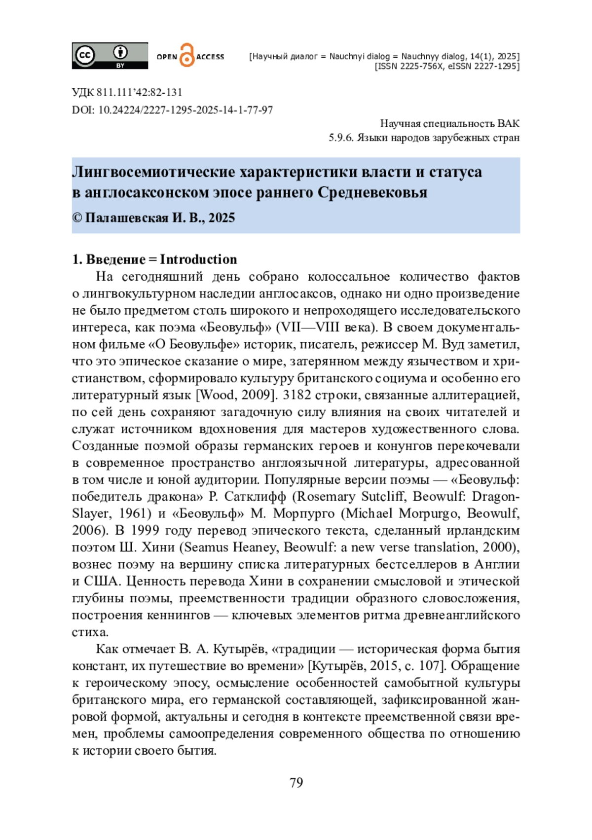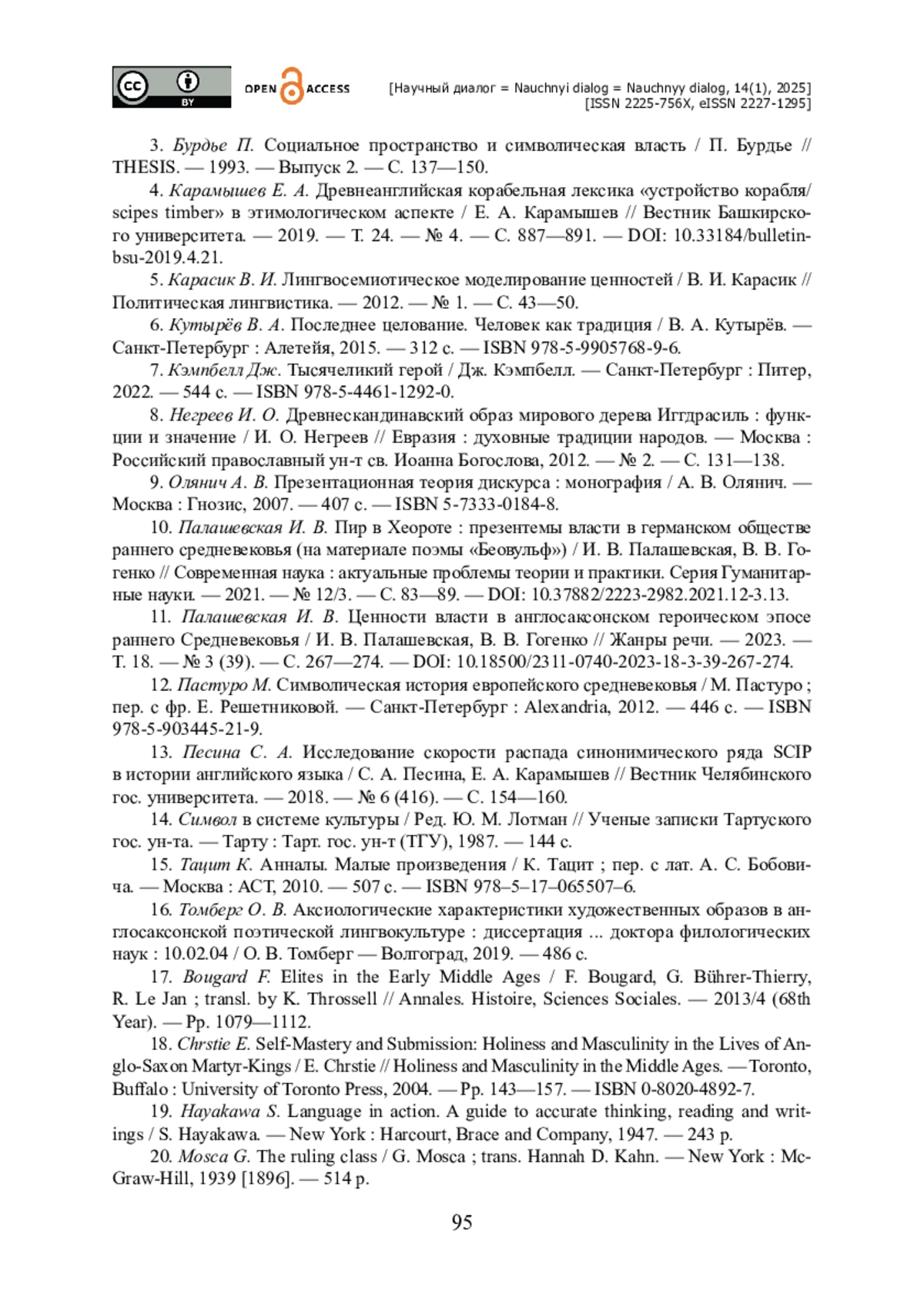 14. Палашевская И. В. Пир в Хеороте : презентемы власти в германском обществе раннего средневековья (на материале поэмы «Беовульф») / И. В. Палашевская, В. В. Гогенко // Современная наука : актуальные проблемы теории и практики. Серия Гуманитарные науки. - 2021. - № 12/3. - С. 83-89. - https://doi.org/10.37882/2223-2982.2021.12-3.13.