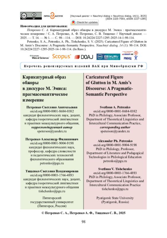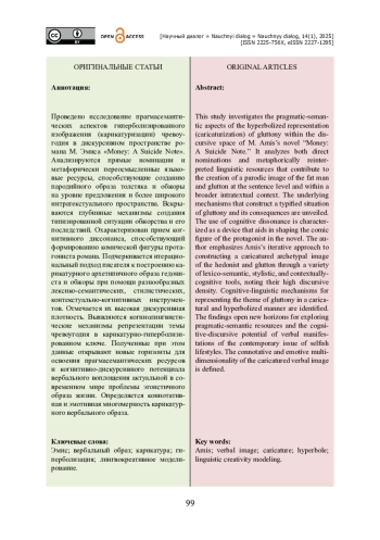 Проведено исследование прагмасемантических аспектов гиперболизированного изображения (карикатуризации) чревоугодия в дискурсивном пространстве романа М. Эмиса «Money: A Suicide Note». Анализируются прямые номинации и метафорически переосмысленные языковые ресурсы, способствующие созданию пародийного образа толстяка и обжоры на уровне предложения и более широкого интратекстуального пространства. Вскрываются глубинные механизмы создания типизированной ситуации обжорства и его последствий. Охарактеризован прием когнитивного диссонанса, способствующий формированию комической фигуры протагониста романа. Подчеркивается итерациональный подход писателя к построению карикатурного архетипичного образа гедониста и обжоры при помощи разнообразных лексико-семантических, стилистических, контекстуально-когнитивных инструментов. Отмечается их высокая дискурсивная плотность. Выявляются когниолингвистические механизмы репрезентации темы чревоугодия в карикатурно-гиперболизированном ключе. Полученные при этом данные открывают новые горизонты для освоения прагмасемантических ресурсов и когнитивно-дискурсивного потенциала вербального воплощения актуальной в современном мире проблемы эгоистичного образа жизни. Определяется коннотативная и эмотивная многомерность карикатурного вербального образа.