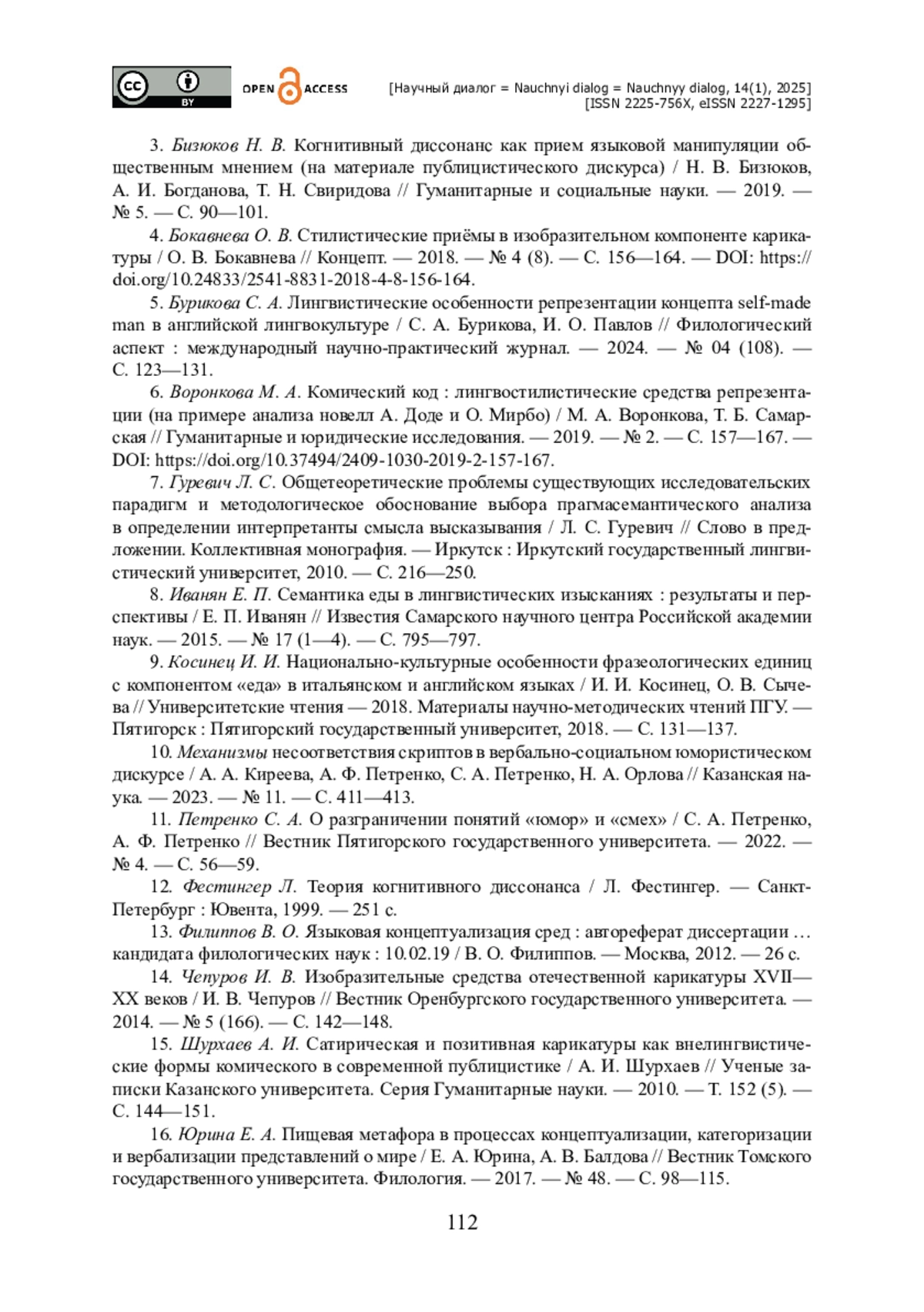 5. Бизюков Н. В. Когнитивный диссонанс как прием языковой манипуляции общественным мнением (на материале публицистического дискурса) / Н. В. Бизюков, А. И. Богданова, Т. Н. Свиридова // Гуманитарные и социальные науки. - 2019. - № 5. - С. 90-101.