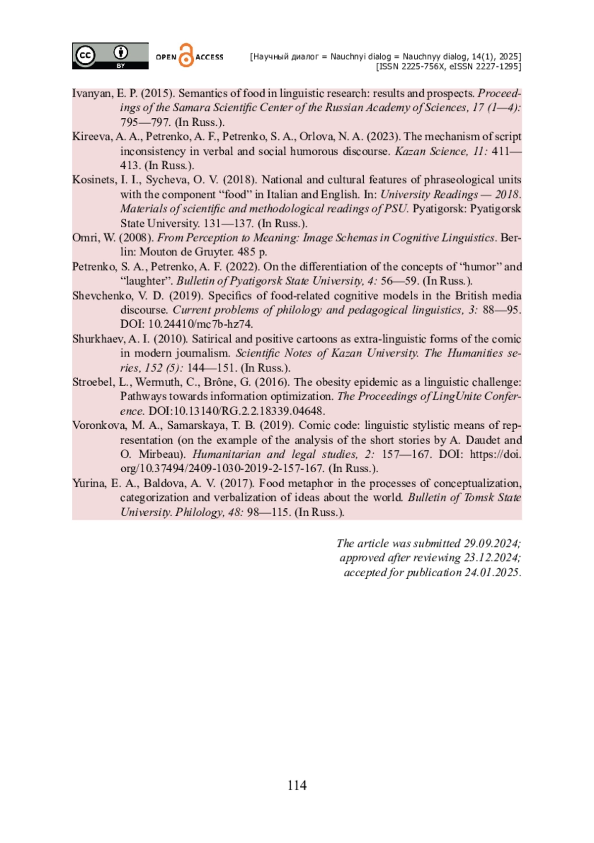 10. Иванян Е. П. Семантика еды в лингвистических изысканиях : результаты и перспективы / Е. П. Иванян // Известия Самарского научного центра Российской академии наук. - 2015. - № 17 (1-4). - С. 795-797.