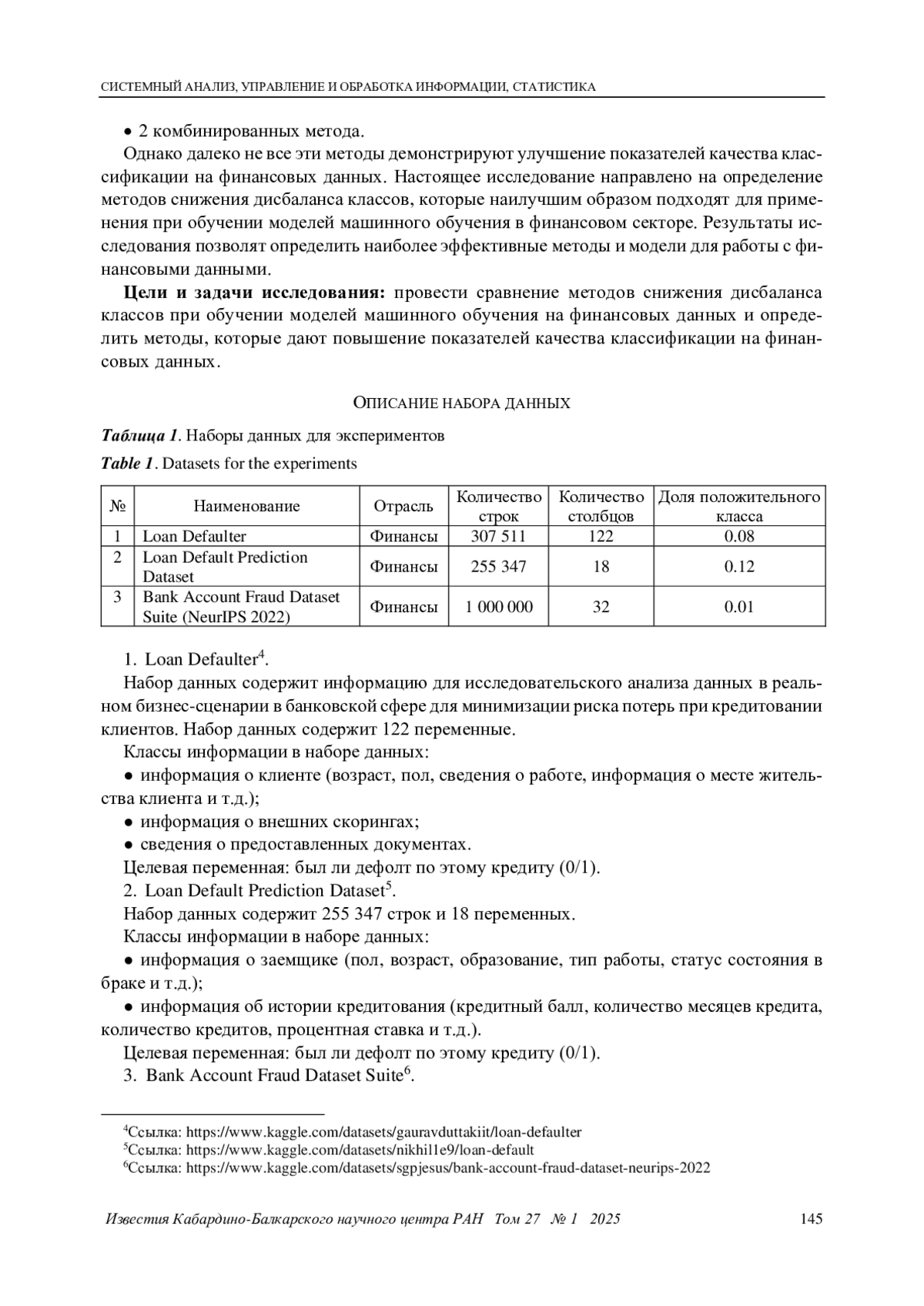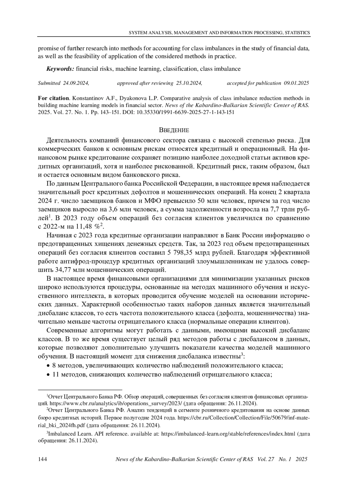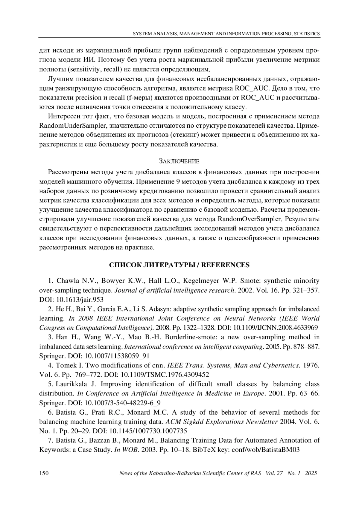 6. 	Batista G., Prati R.C., Monard M.C. A study of the behavior of several methods for balancing machine learning training data. ACM Sigkdd Explorations Newsletter 2004. Vol. 6. No. 1. Pp. 20-29. DOI: 10.1145/1007730.1007735