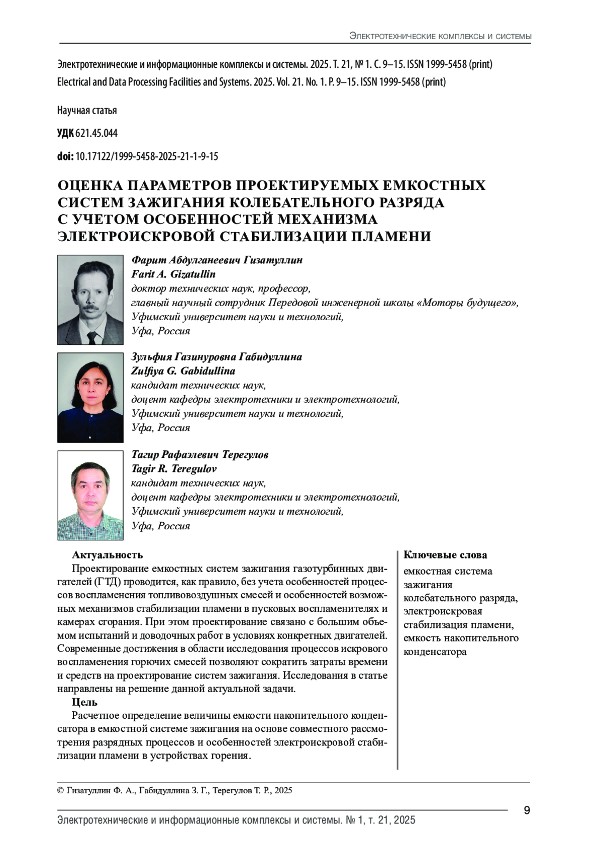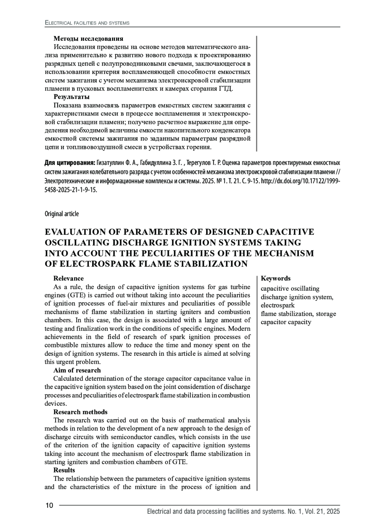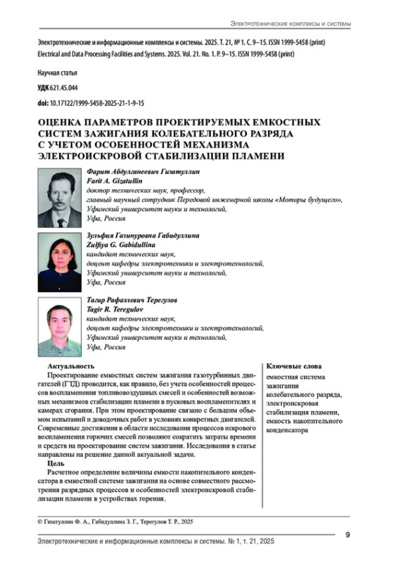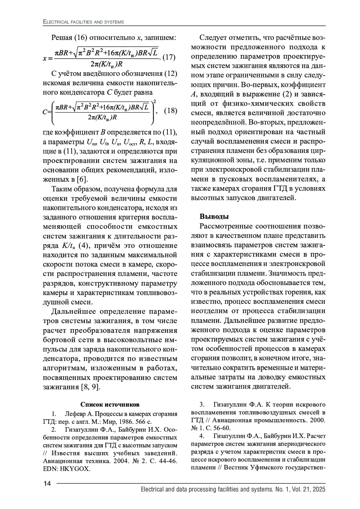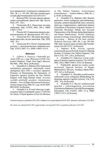 2. 	Гизатуллин Ф.А., Байбурин И.Х. Особенности определения параметров емкостных систем зажигания для ГТД с высотным запуском // Известия высших учебных заведений. Авиационная техника. 2004. № 2. С. 44-46.  EDN: HKYGOX
