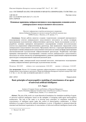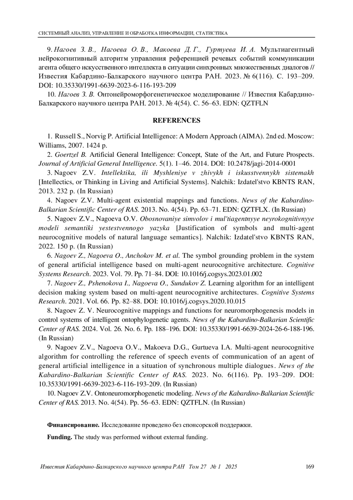 9. 	Нагоев З. В., Нагоева О. В., Макоева Д. Г., Гуртуева И. А. Мультиагентный нейрокогнитивный алгоритм управления референцией речевых событий коммуникации агента общего искусственного интеллекта в ситуации синхронных множественных диалогов // Известия Кабардино-Балкарского научного центра РАН. 2023. № 6(116). С. 193-209. DOI: 10.35330/1991-6639-2023-6-116-193-209 EDN: RXSQVI
