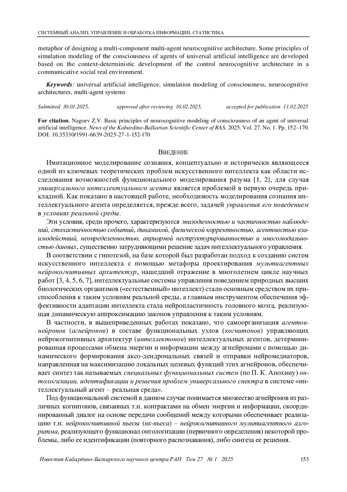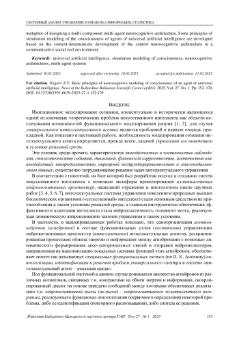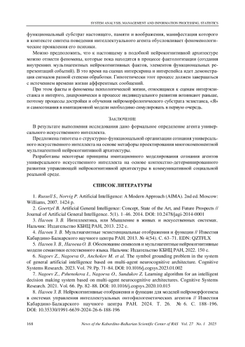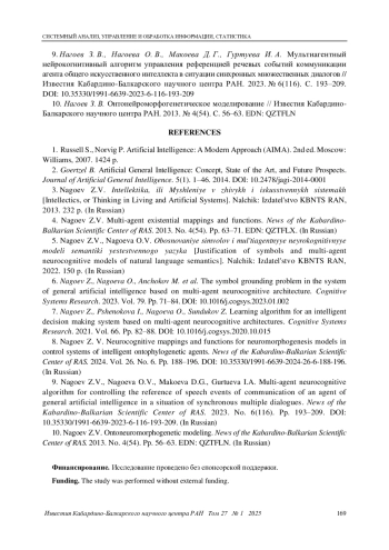 8. 	Нагоев З. В. Нейрокогнитивные отображения и функции для моделей нейроморфогенеза в системах управления интеллектуальных онтофилогенетических агентов // Известия Кабардино-Балкарского научного центра РАН. 2024. Т. 26. № 6. С. 188-196. DOI: 10.35330/1991-6639-2024-26-6-188-196 EDN: WQHLUG