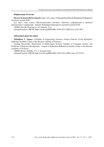 7. 	Nagoev Z., Pshenokova I., Nagoeva O., Sundukov Z. Learning algorithm for an intelligent decision making system based on multi-agent neurocognitive architectures. Cognitive Systems Research. 2021. Vol. 66. Pp. 82-88. DOI: 10.1016/j.cogsys.2020.10.015 EDN: YADGHN