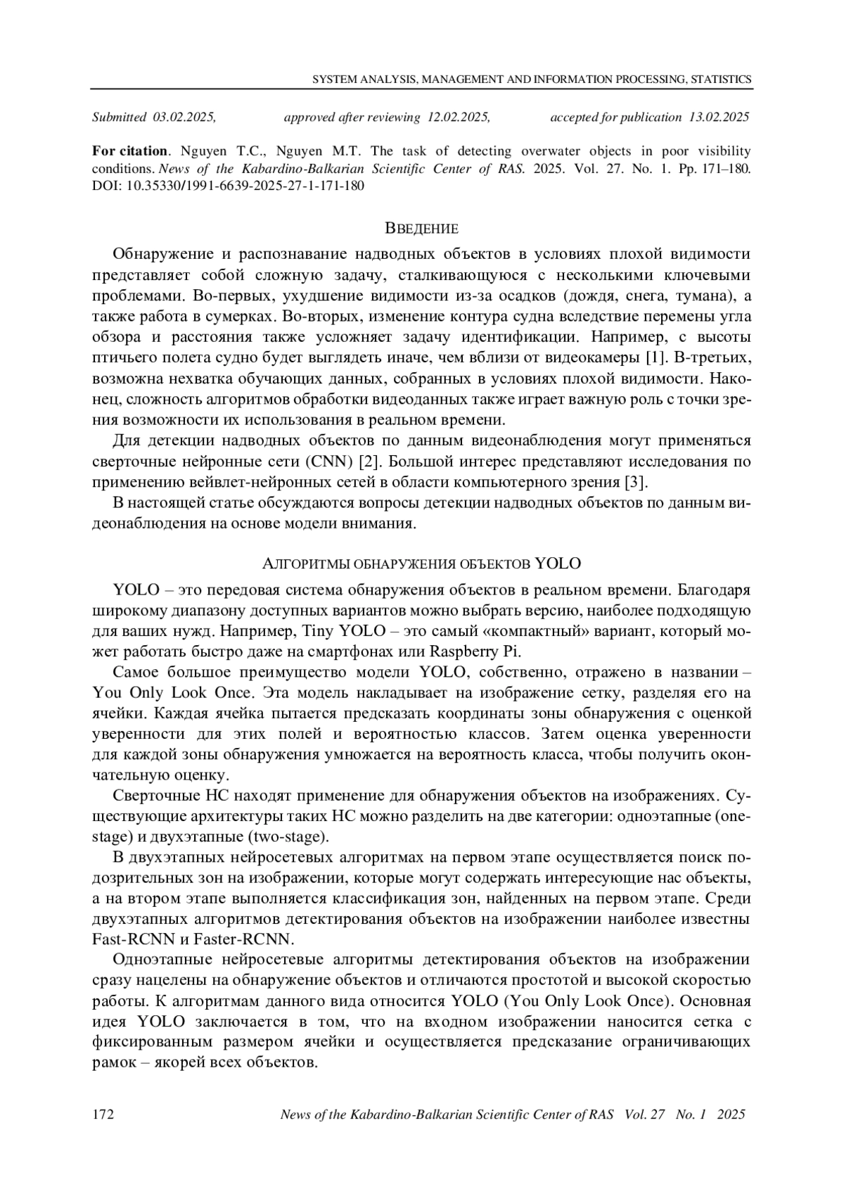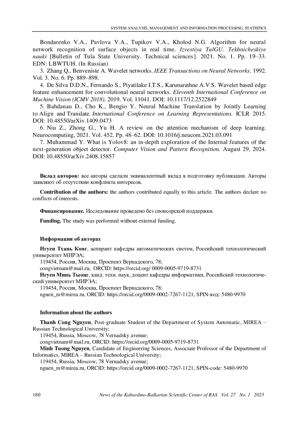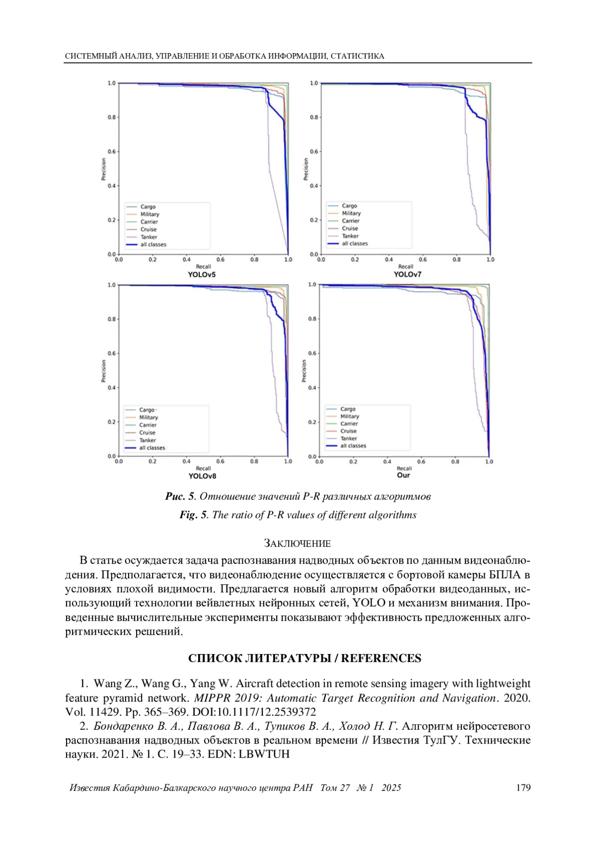 2. 	Бондаренко В. А., Павлова В. А., Тупиков В. А., Холод Н. Г. Алгоритм нейросетевого распознавания надводных объектов в реальном времени // Известия ТулГУ. Технические науки. 2021. № 1. C. 19-33. EDN: LBWTUH
