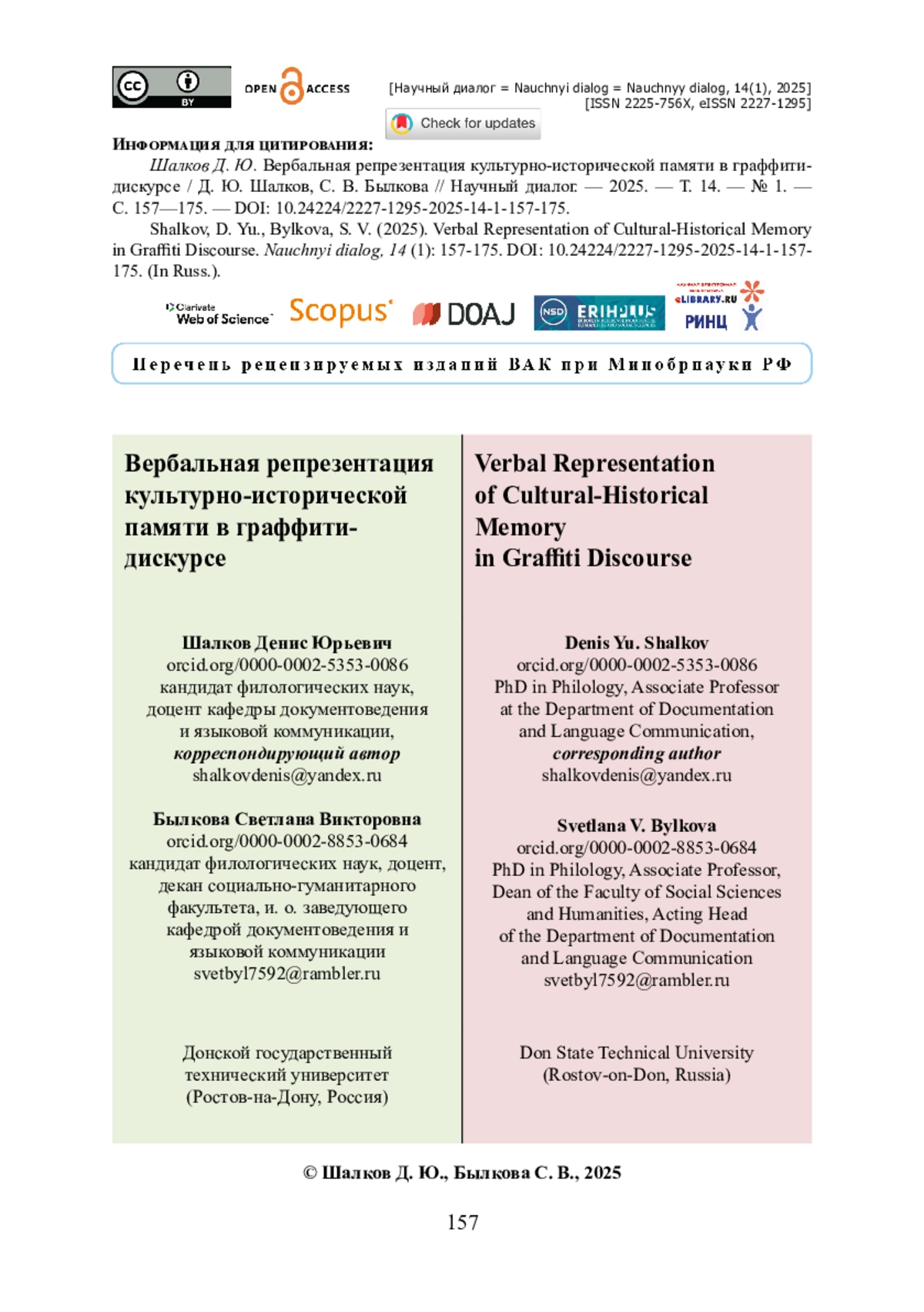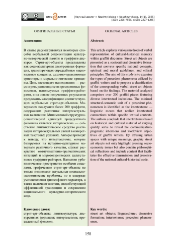 В статье рассматриваются некоторые способы вербальной репрезентации культурно-исторической памяти в граффити-дискурсе. Стрит-арт-объекты представлены как социокультурная дискурсивная формация, транслирующая определённые национальные концепты, духовно-нравственные ориентиры и морально-этические принципы. Цель настоящего исследования — рассмотреть разновидности прецедентных феноменов, используемых граффити-райтерами, и на основе полученных результатов предложить классификацию соответствующих вербальных стрит-арт-объектов. Материалом послужили более 200 граффити, содержащих различные интертекстуальные включения. Минимальной структурно-семантической единицей прецедентного феномена является интертекстема — собственно лингвистическое средство реализации интертекстуальных связей в конкретных текстовых условиях. Авторы приходят к выводу, что интертекстемы, которые базируются на историко-культурном материале различного качества, служат раскрытию коммуникативно-прагматических интенций и мировоззренческих целеустановок граффити-райтеров. Наполняя урбанистическое пространство особыми смыслами, графические стрит-арт-объекты не только поднимают актуальные социально-экономические проблемы, но и содержат умозаключения философского характера, а также включают контент, способствующий эффективной трансляции и сохранению национального культурно-исторического кода.
