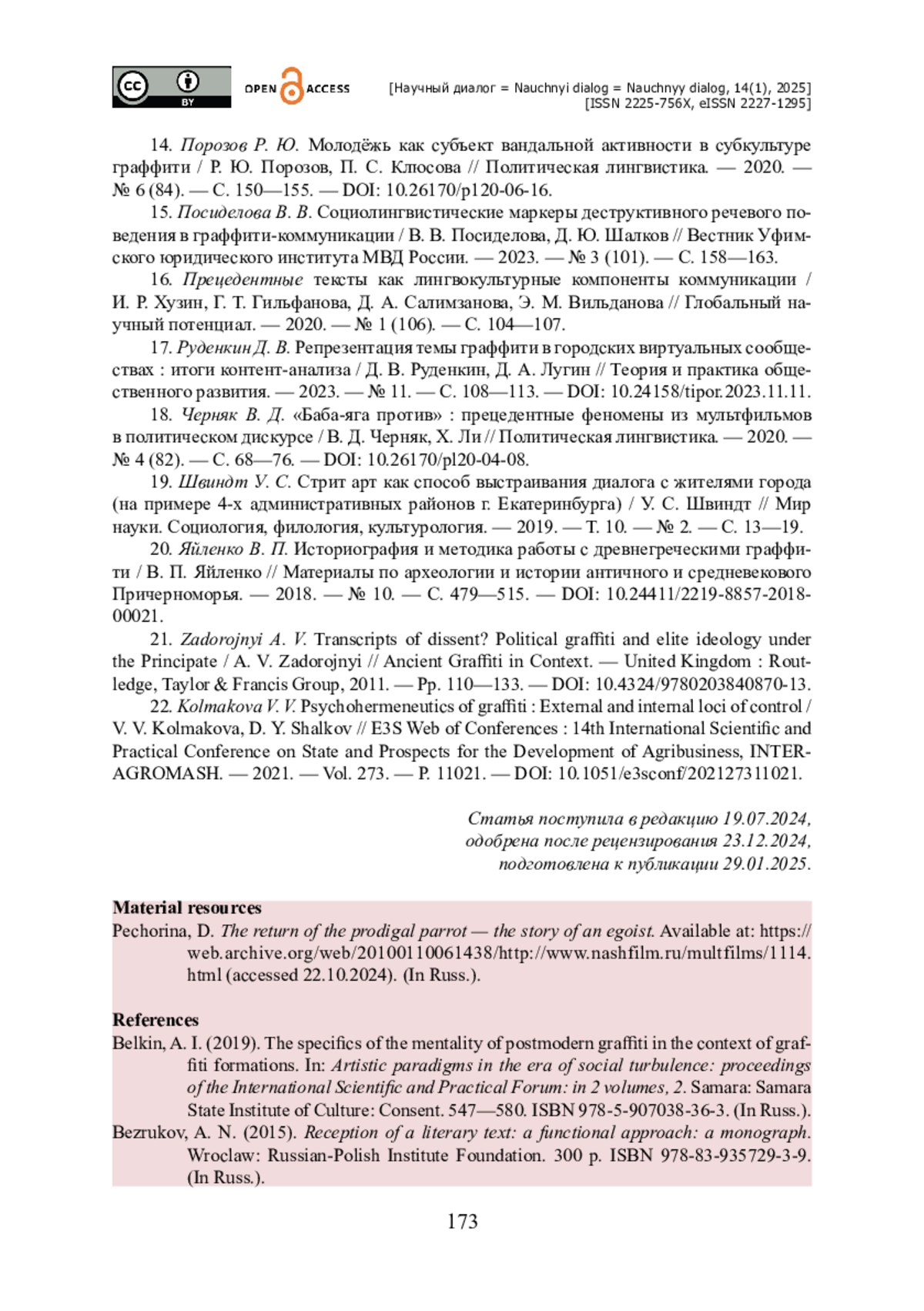 15. Порозов Р. Ю. Молодёжь как субъект вандальной активности в субкультуре граффити / Р. Ю. Порозов, П. С. Клюсова // Политическая лингвистика. - 2020. - № 6 (84). - C. 150-155. - https://doi.org/10.26170/p120-06-16.