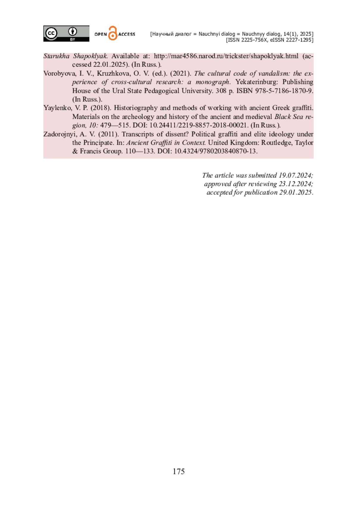 21. Яйленко В. П. Историография и методика работы с древнегреческими граффити / В. П. Яйленко // Материалы по археологии и истории античного и средневекового Причерноморья. - 2018. - № 10. - С. 479-515. - https://doi.org/10.24411/2219-8857-2018-00021.